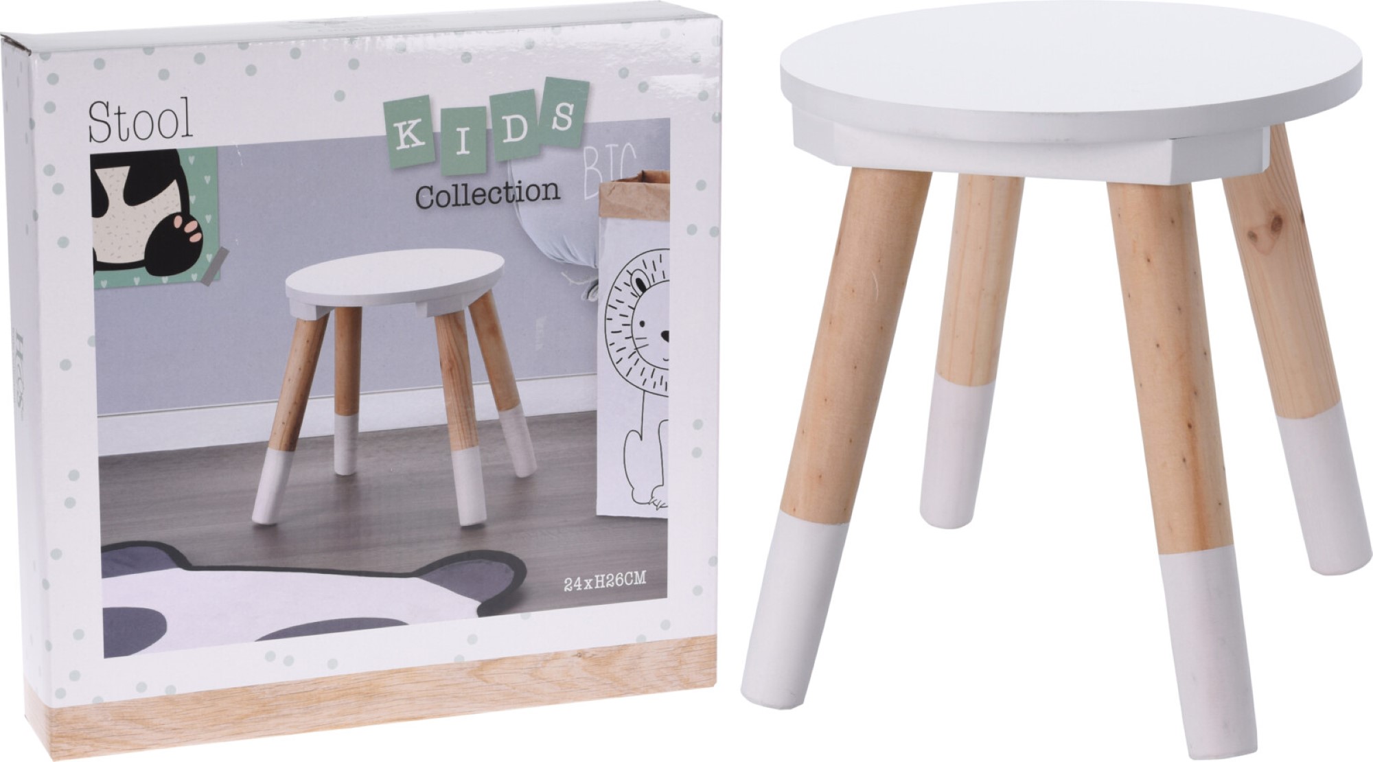 Barnpall med härlig design. Stolen har vitmålat huvud och ben. Pallen är lätt att hålla ren.