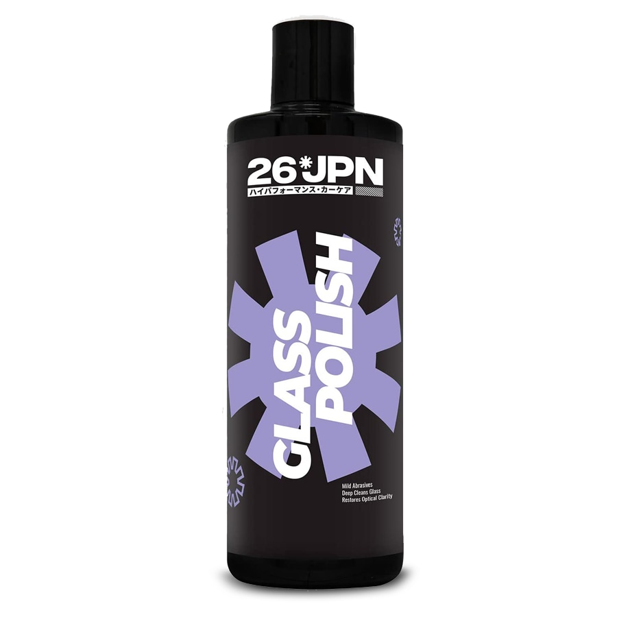 26JPN Glass Polish innehåller både rengöringsmedel och milda slipmedel, tack vare vilka glasytan rengörs på djupet och dess optiska ljusstyrka återställs.