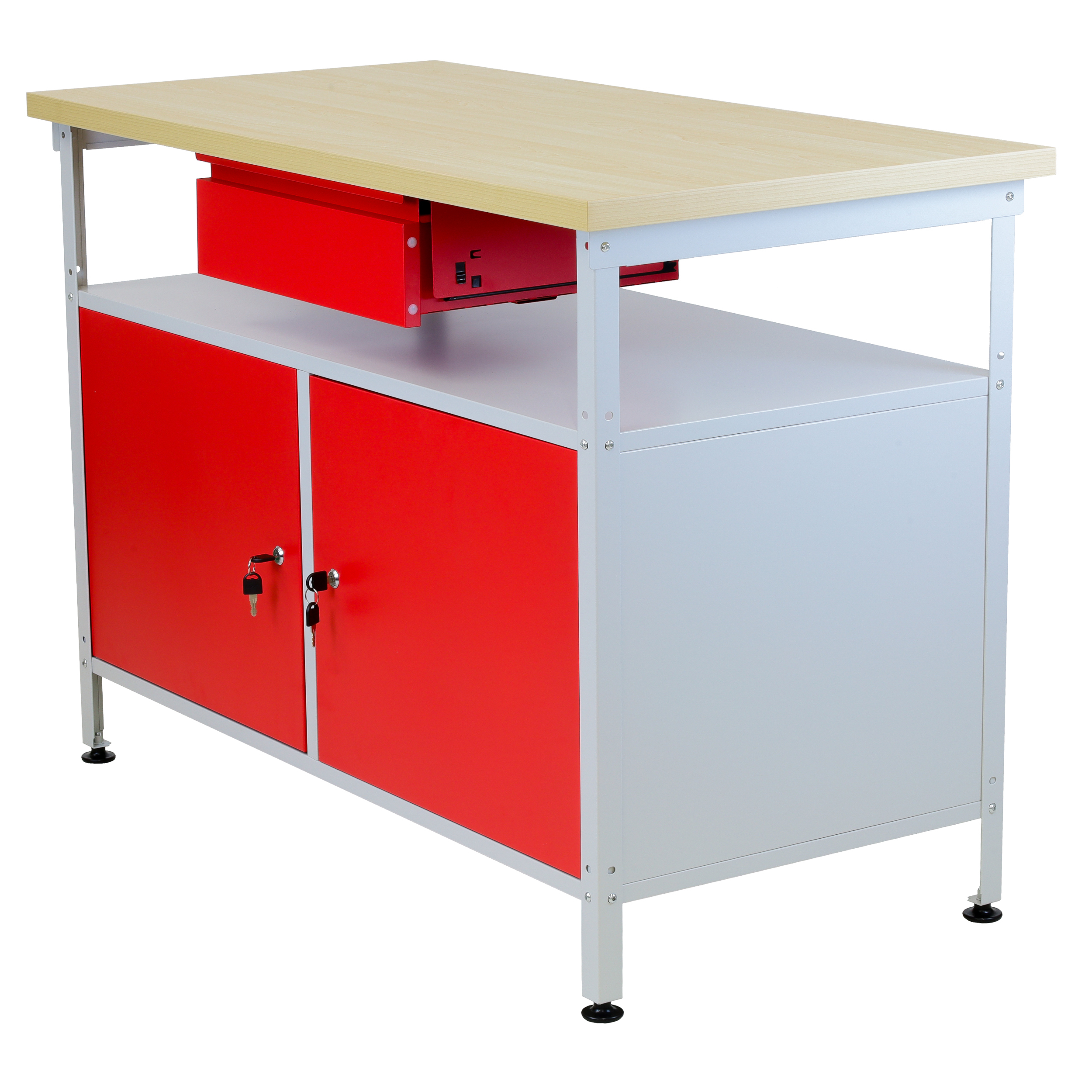 En perfekt arbetsbänk att ha i garaget! Den robusta bänken har 2 stycken skåp, varav ena sidan har hylla och båda är låsbara. 1 draglåda och justerbara fötter.