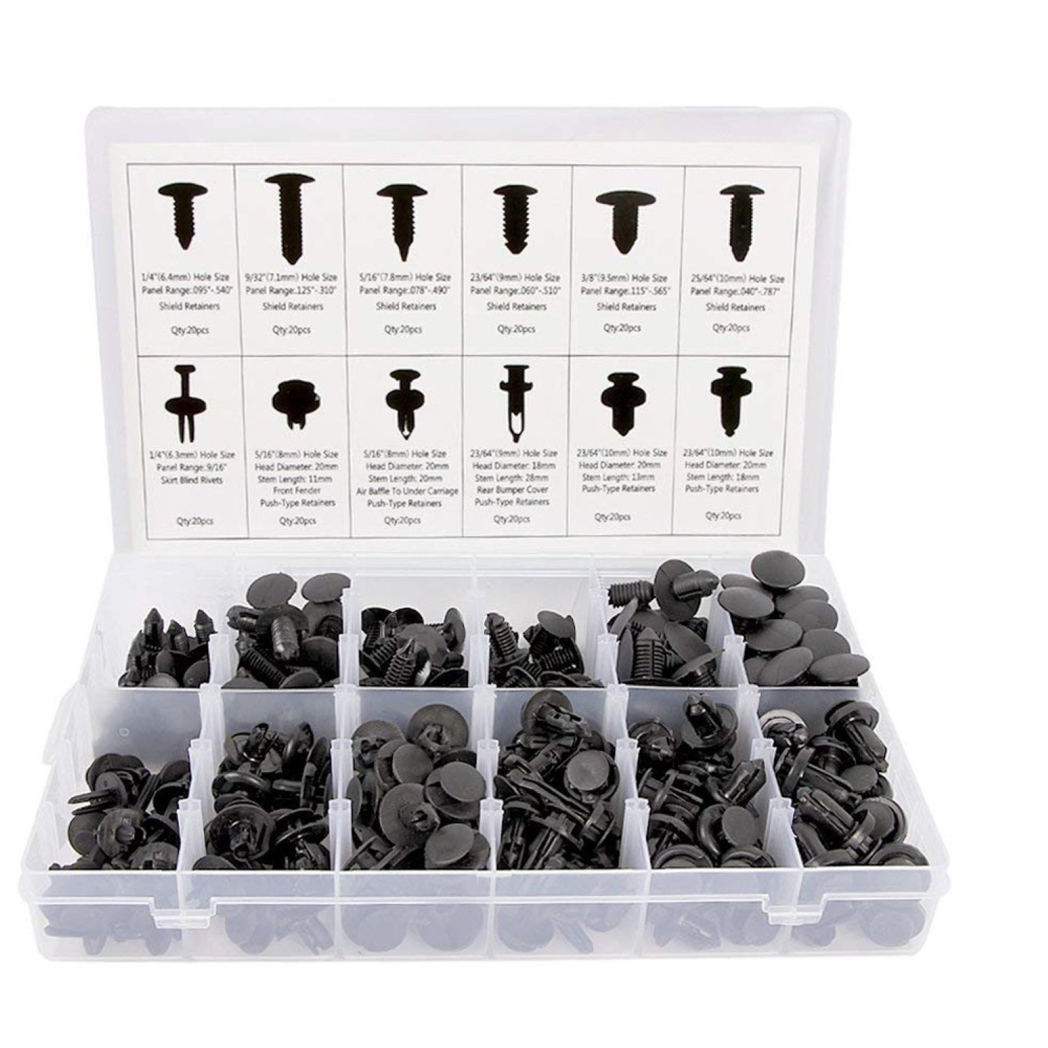Sortiment av plastfästen/clips. 12 olika fästelement, totalt 240 delar.