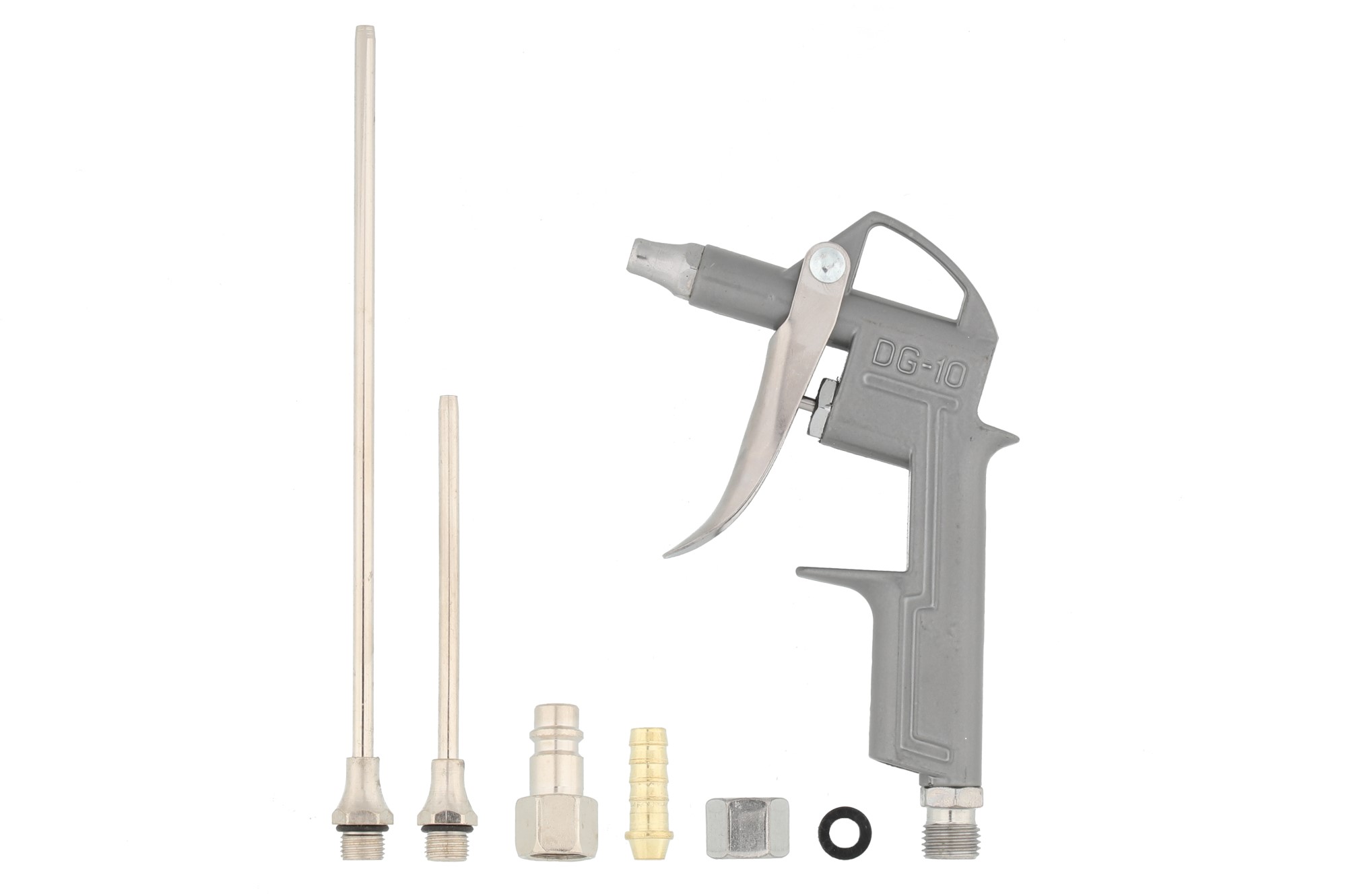 Blåspistolsats för tryckluft. Metall ram. Inkluderar kontakt. Max tryck 10 bar. utbytbara munstycken 20, 100 och 200 mm.