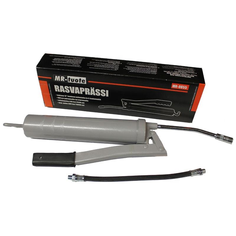Fettpress + slang 12" Stålskal Arbetstryck 380 bar Max tryck 750 bar Kapacitet: 400 g fettladdning 1 st 12" gummislang Ø 11 mm, munstycke med fyra käftar
