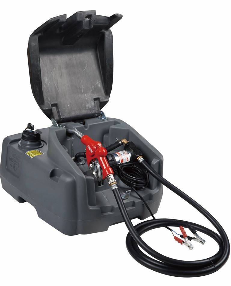 GXT tank för eldningsolja/diesel. 12V-pumpen är integrerad under tanklocket. Locket är låsbart. Snabb och säker tankning. Förvaringsutrymme för slangen under locket. Tanken är utrustad med en spolplatta. Lågprofilmodell, passar de flesta pickupbilar under taket.