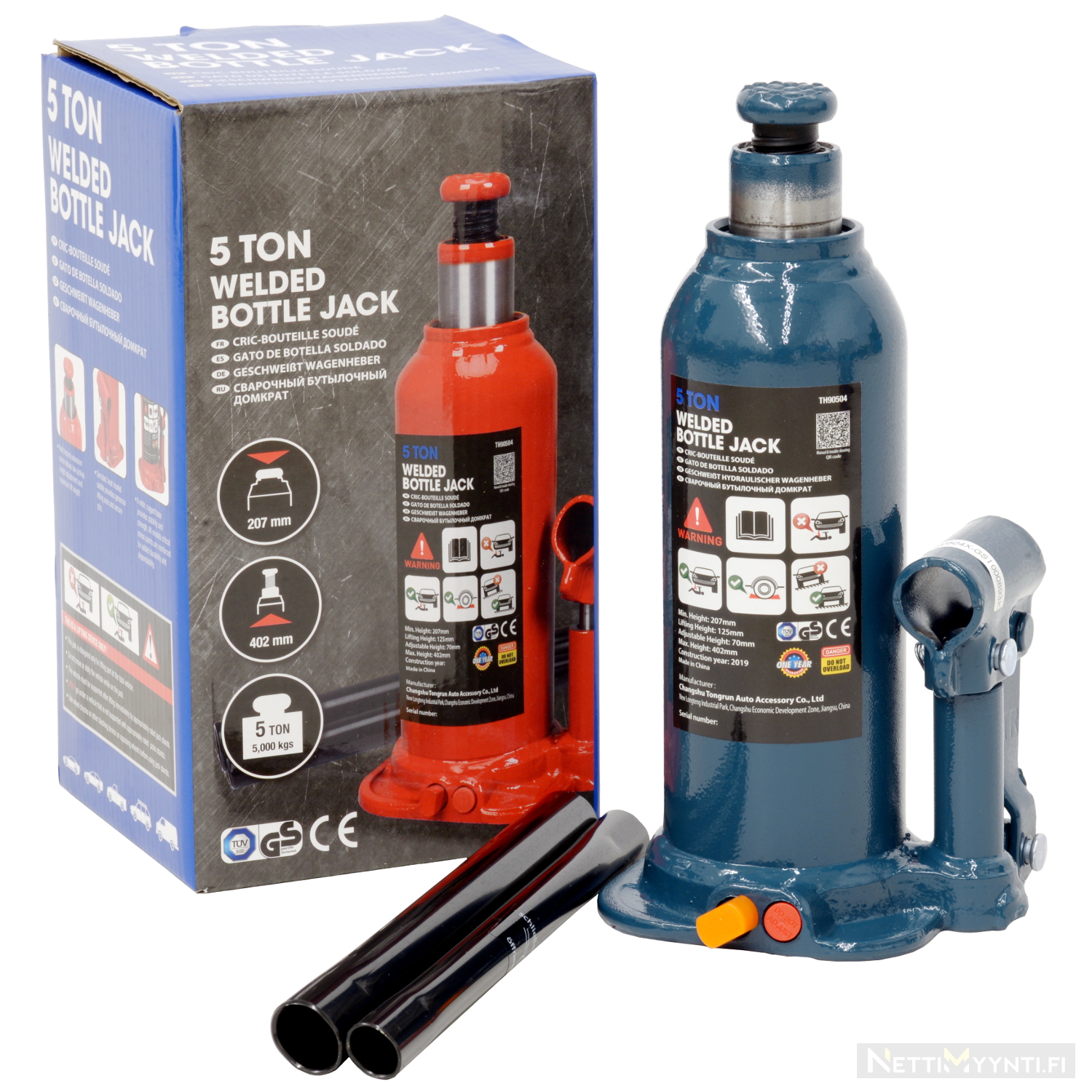 Hydraulisk domkraft med en kapacitet på 2 ton, ställskruv för extra lyfthöjd, gjuten på platta. Pumphandtag ingår.