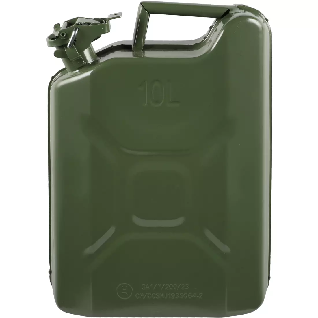 Grön 10 liters stål jerrykanna för förvaring och transport av bensin och diesel, UN-typgodkänd.