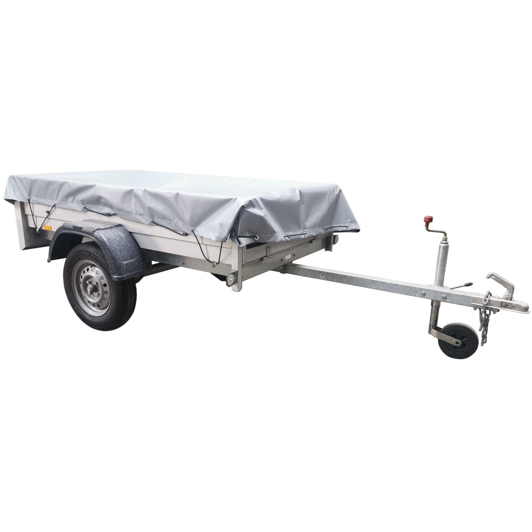 Släpvagnsöverdrag med fästpunkter ca 30 cm från varandra. Materialstyrka 550g/m2. Segelringar och flexibelt fästsnöre. UV-skyddad.