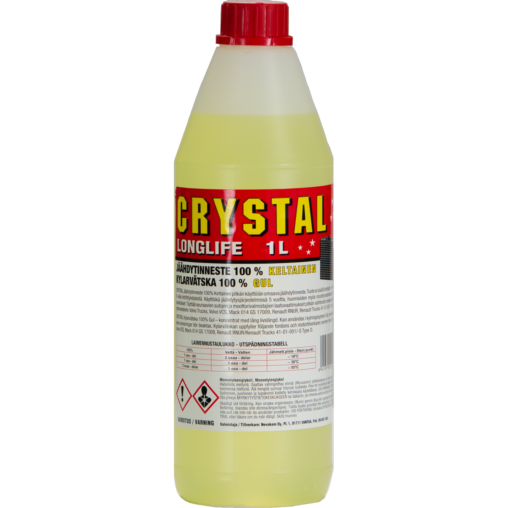Crystal Longlife kylvätska är en högkvalitativ, nya generationens kylvätska som är särskilt utformad för kylare i bensin-, el-, hybrid- och dieselmotorer. Denna kylvätska är helt nitritfri, aminfri, silikatfri och borfri, vilket gör den mer miljövänlig och säker att använda. Dess basmaterial är etylenglykol, vilket garanterar utmärkt kylningseffektivitet och långvarigt skydd för motorn.