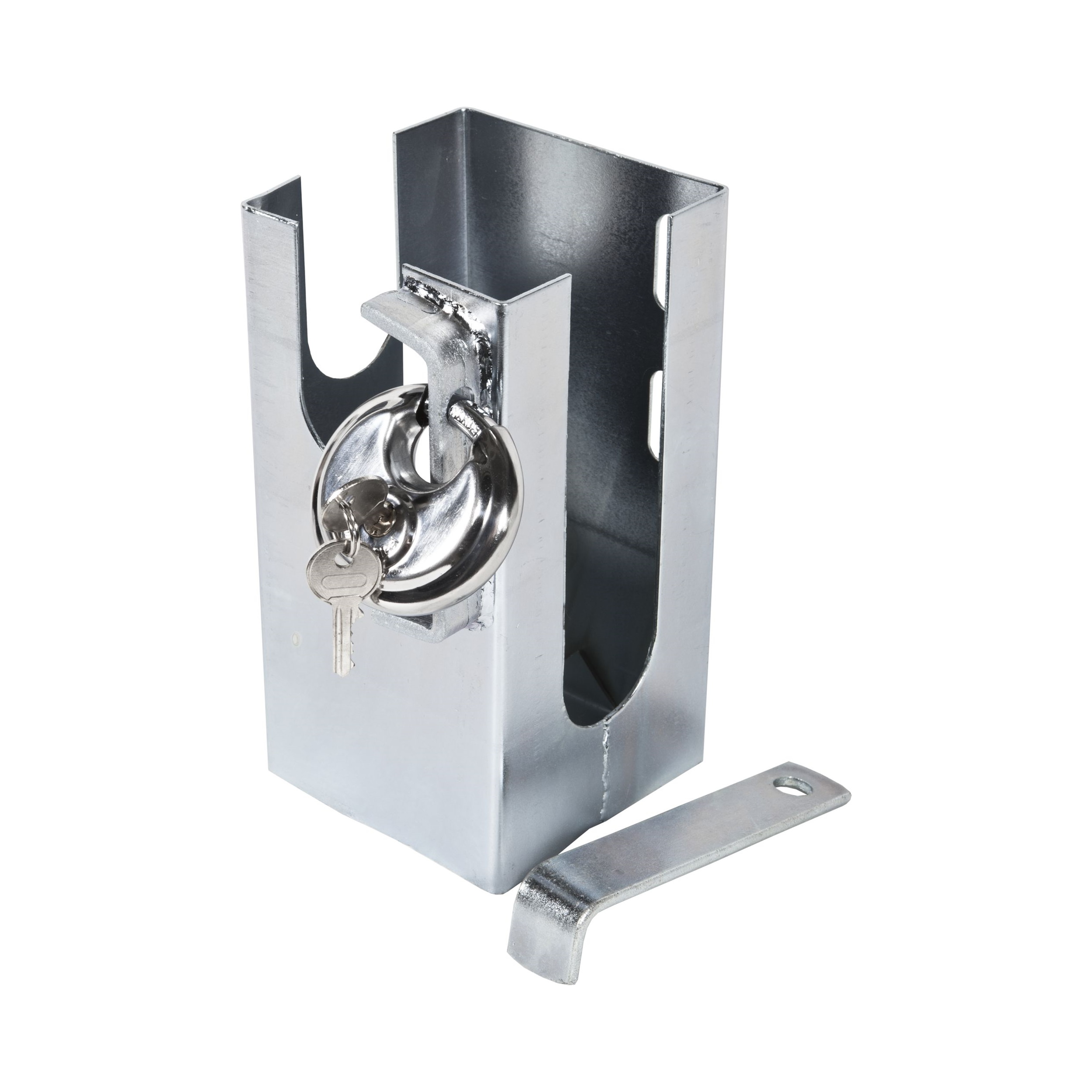 Släpvagnslås för låsning av dragstången på släpvagn, husvagn mm. Tillverkad av galvaniserat väderbeständigt stål, i paketet ingår ett lås.