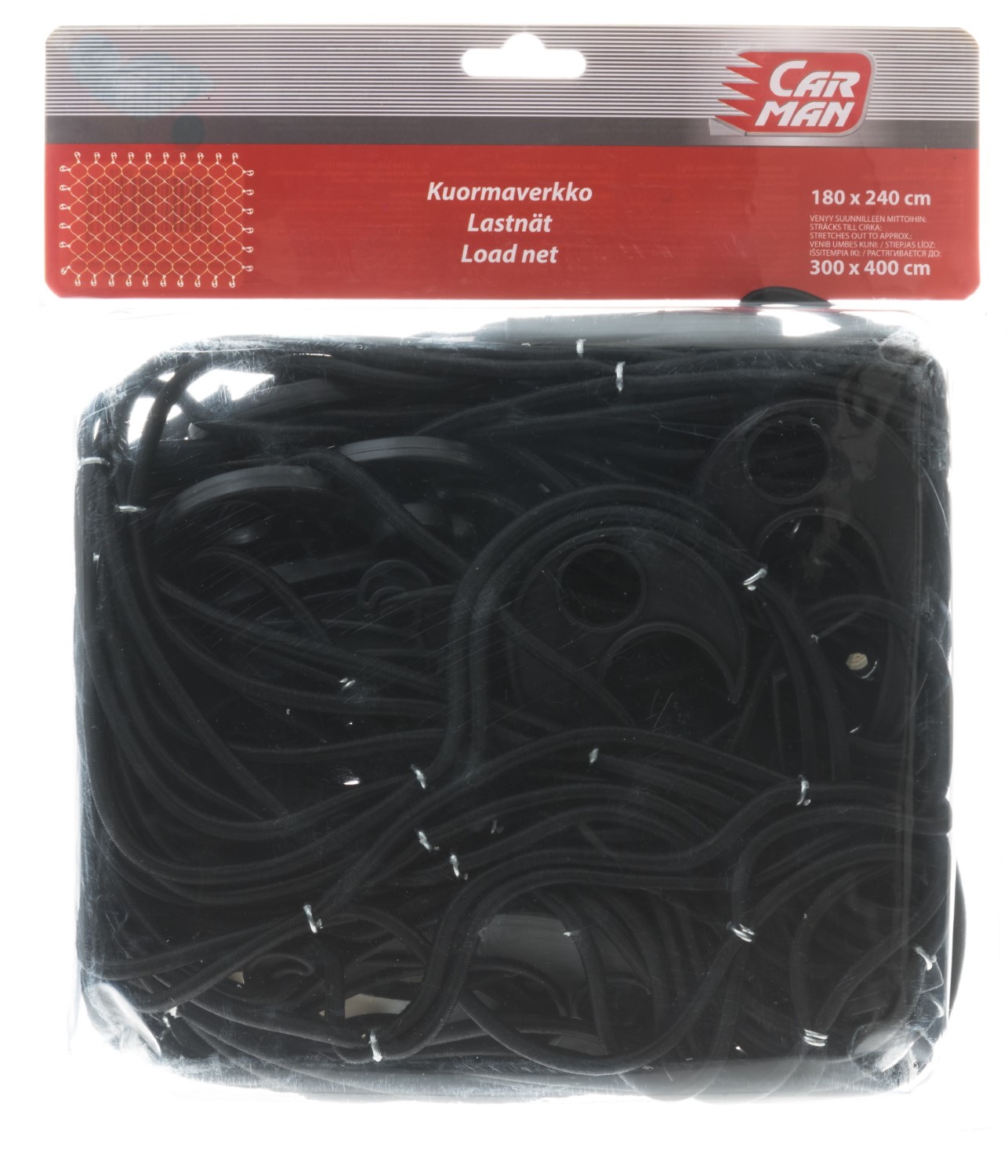 Maximal sträckt storlek ca 300 x 400 cm. Fästning med plastkrokar 32 st. Nät förstärkta med metallöglor. Reptjocklek: 4,5 mm.
