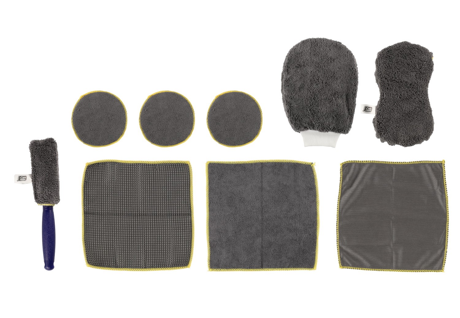Ett heltäckande bilrengöringsset som innehåller 9 rengöringsartiklar i mikrofiber.