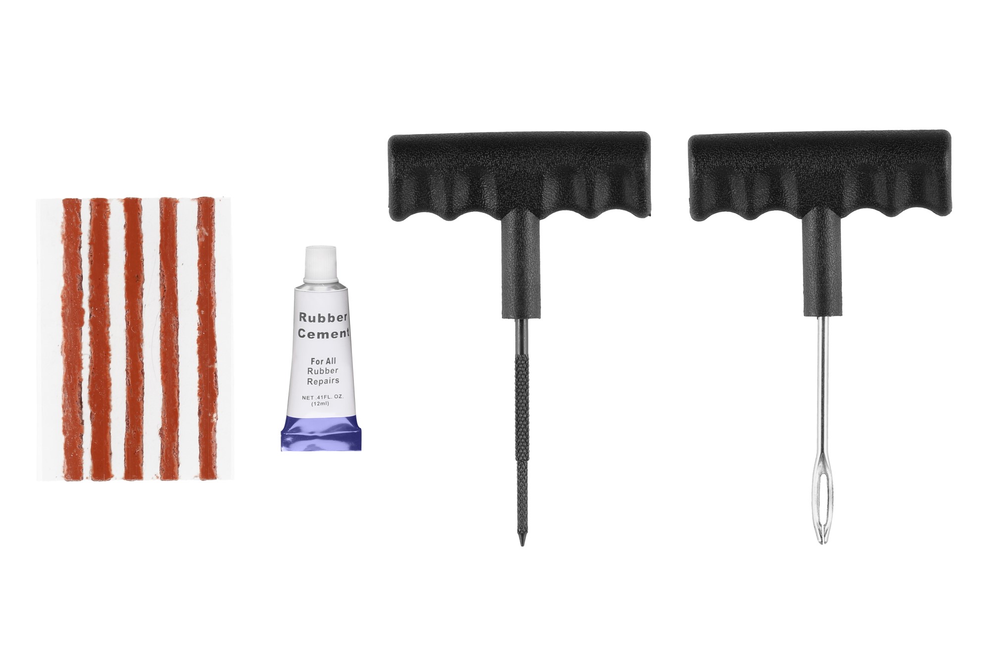 Verktyg för att laga ett hål i ett slanglöst däck. Detta kit innehåller: ett raspverktyg för att vidga och rengöra hålen, ett nålverktyg för att installera distansen, 5 st däcktätningar och en gummilimsats.