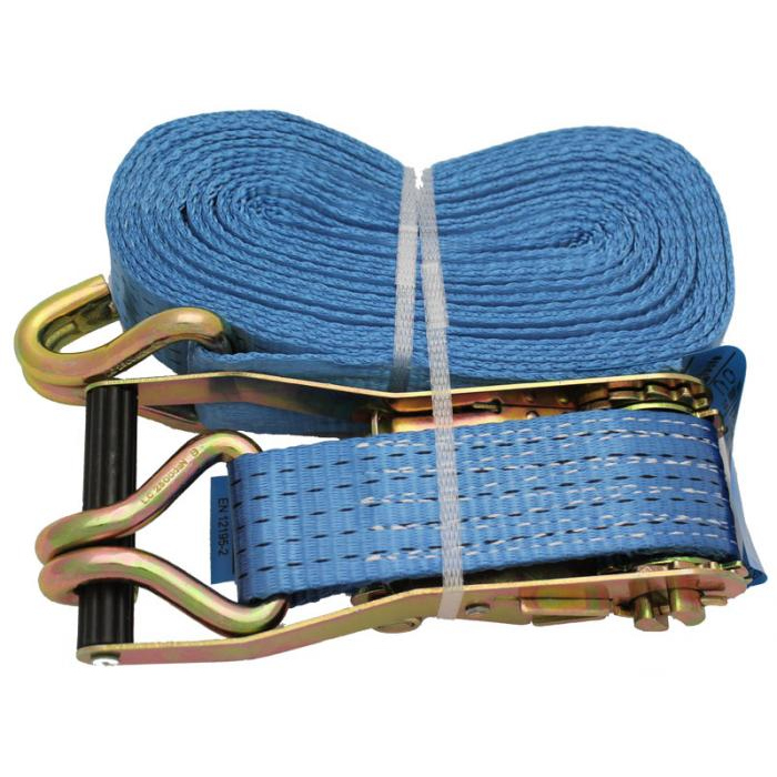 Spännband, längd 10 meter (9.5 m + 0.5 m), bredd 5 cm. Material 100% polyester, kapacitet 5000 kg.