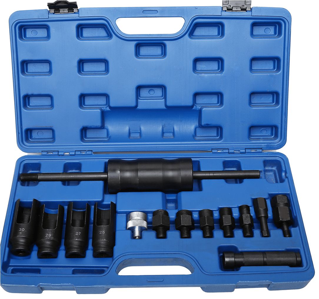 14-delar verktygssats för borttagning av munstycken som inkluderar adaptrar för Bosch, Delphi, Denso och Siemens munstycken. Ledningen i setet gör att munstyckena kan dras ut även från svåra ställen. Setet innehåller öppna hylsor och nycklar för att öppna munstyckena och adaptrar med vilka glidhammaren kan fästas stadigt på munstyckskroppen.