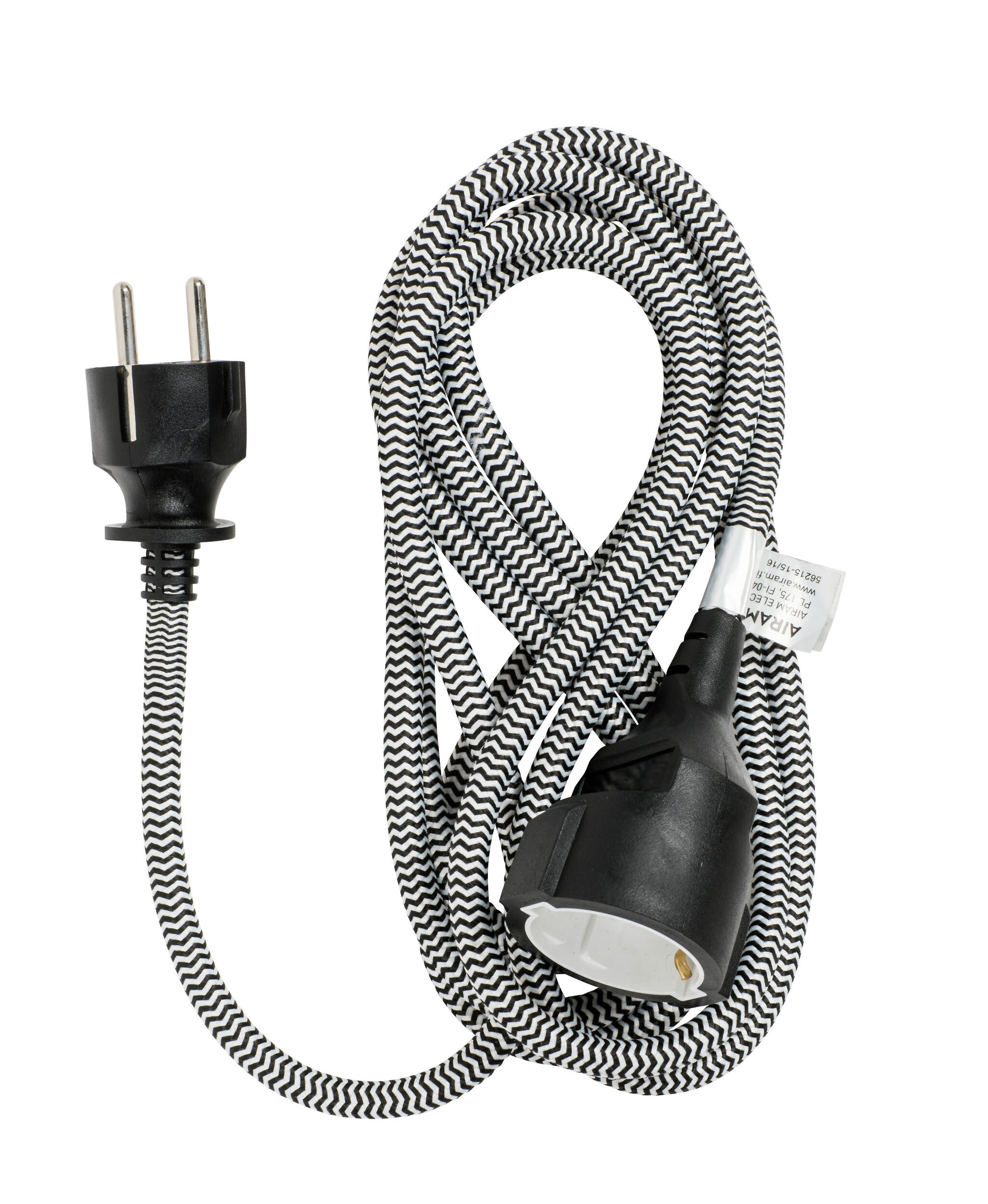 Med textilbeklädda skarvsladdar blir det ordning på hemmets sladdar på ett elegant och roligt sätt - vem säger att en hög sladdar inte kan vara ett inredningselement! Sladdarna har svartvitt sick-sack-mönster, höljet är svart eller vitt. Alternativ finns att få med både euro- och schuko-uttag. Sladden är 2 m, 1-vägs modellen finns att få också med 3 m sladd.