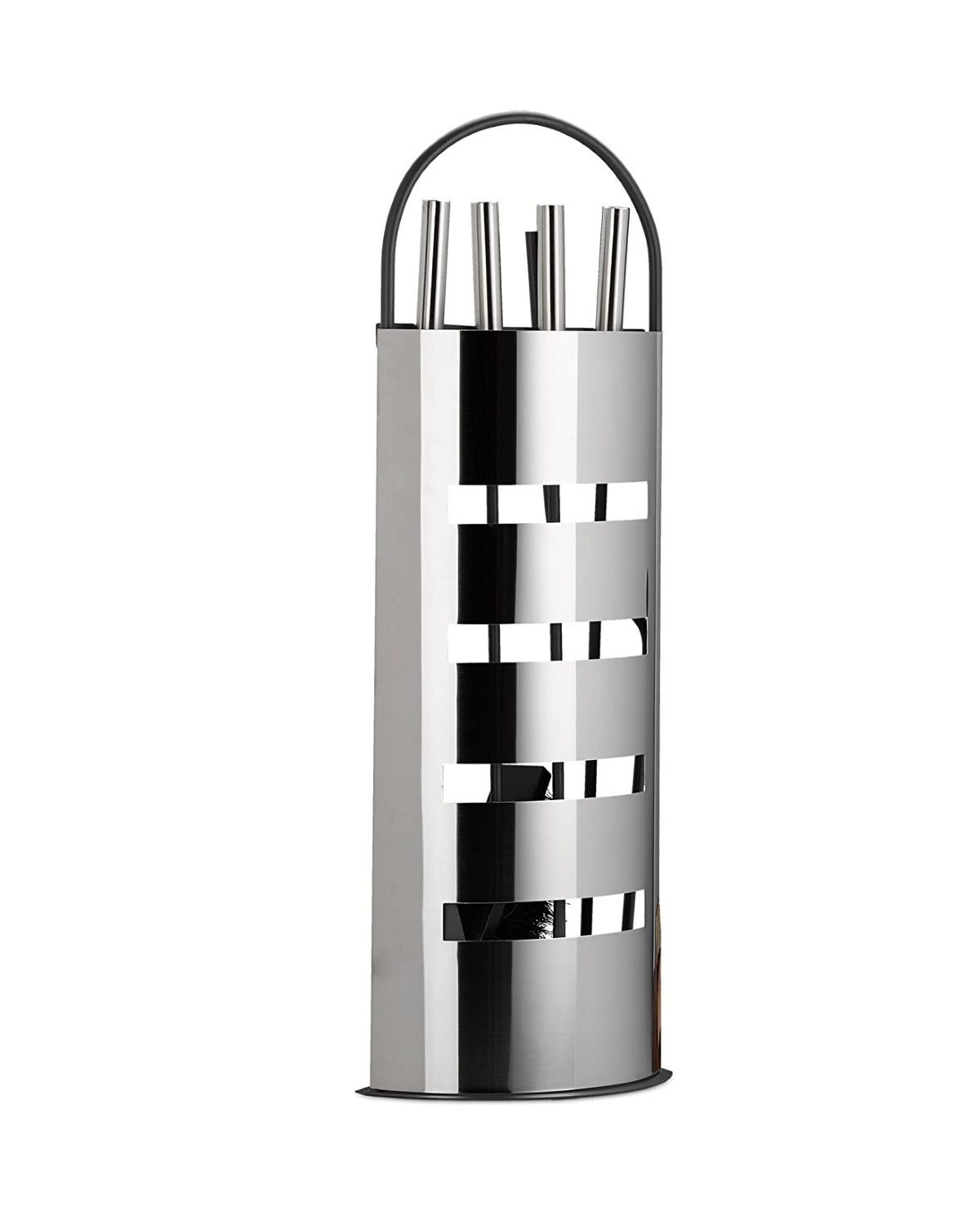 Snygg och hållbar eldstadsutrustning i ett golvställ som är lätt att placera bredvid eldstaden, och gör sig riktigt snygg. Innehåller 4 verktyg. Alla delar är gjorda av rostfritt stål. I mobilstället håller verktygen sig i god ordning.