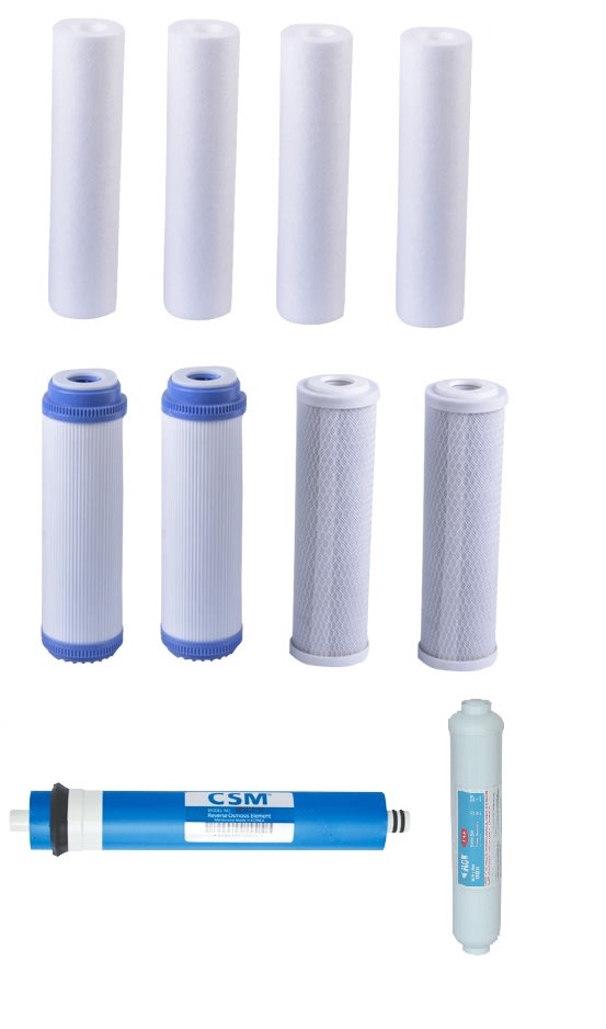 Set med 10 ersättningsfilter för Adwasys RO370-UV enhet för omvänd osmos. I paketet ingår ett års ersättningsfilterbehov för åretruntbruk eller två års behov för sommarvattenanvändning.