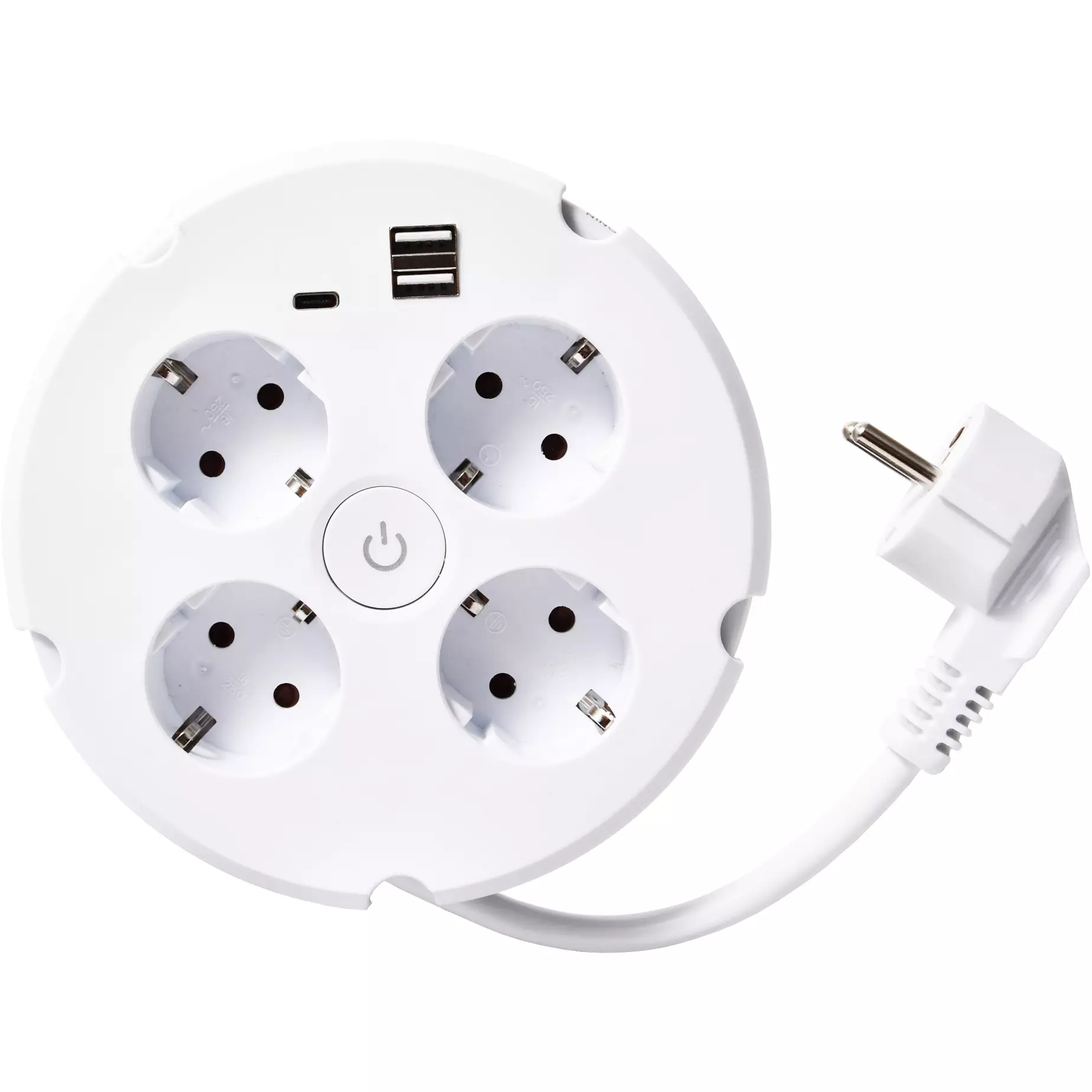 Mångsidigt förlängningsuttag som erbjuder fyra Schuko-uttag samt USB-C och USB-A för laddning. Perfekt för kontorsbord, arbetsplatser och köksbänkar. Förlängningsuttaget är skyddat mot överspänning och överladdning, vilket garanterar säker laddning och användning av dina enheter.