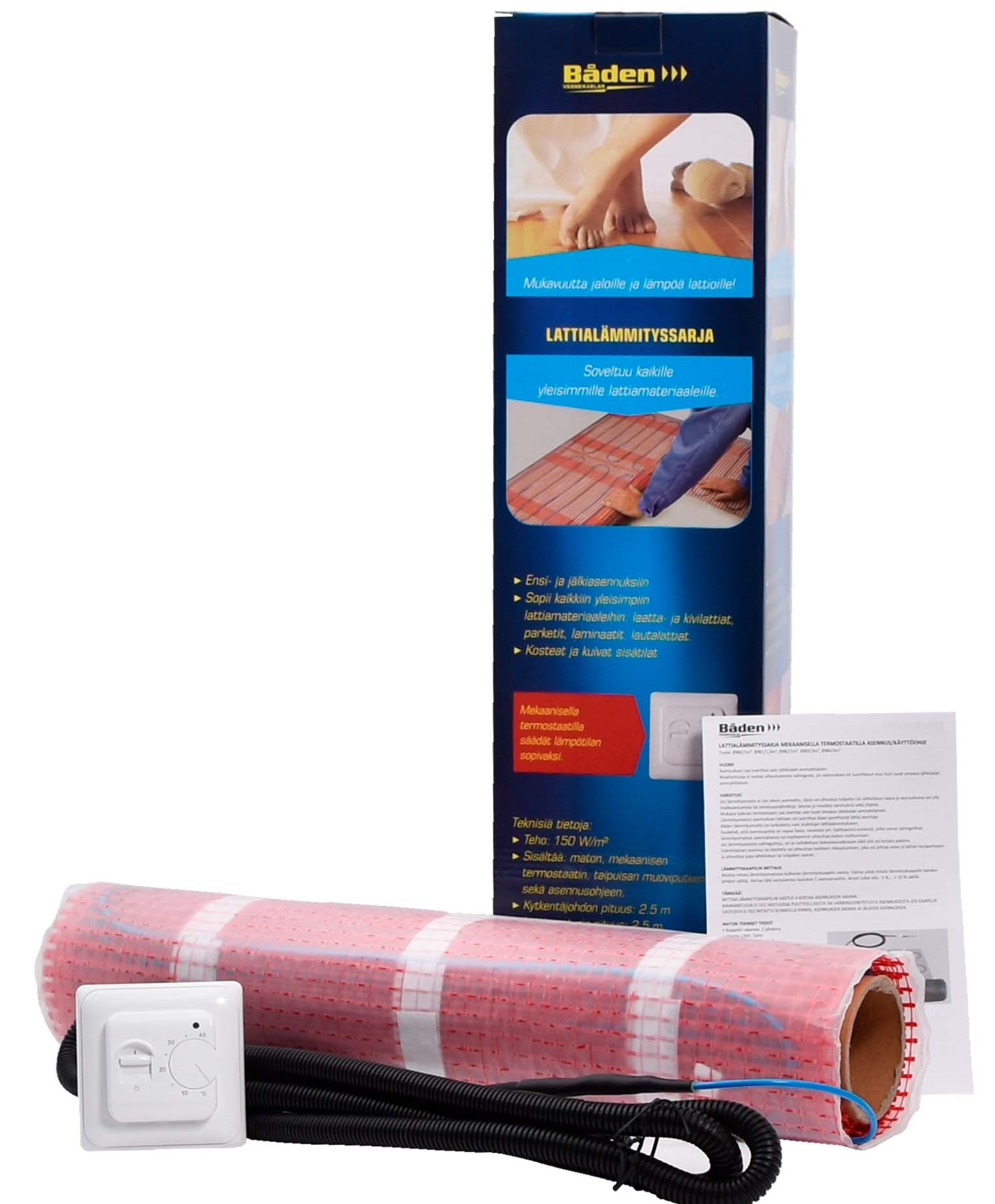 Paketet innehåller: matta, digital termostat, flexibelt rör och installationsanvisningar.