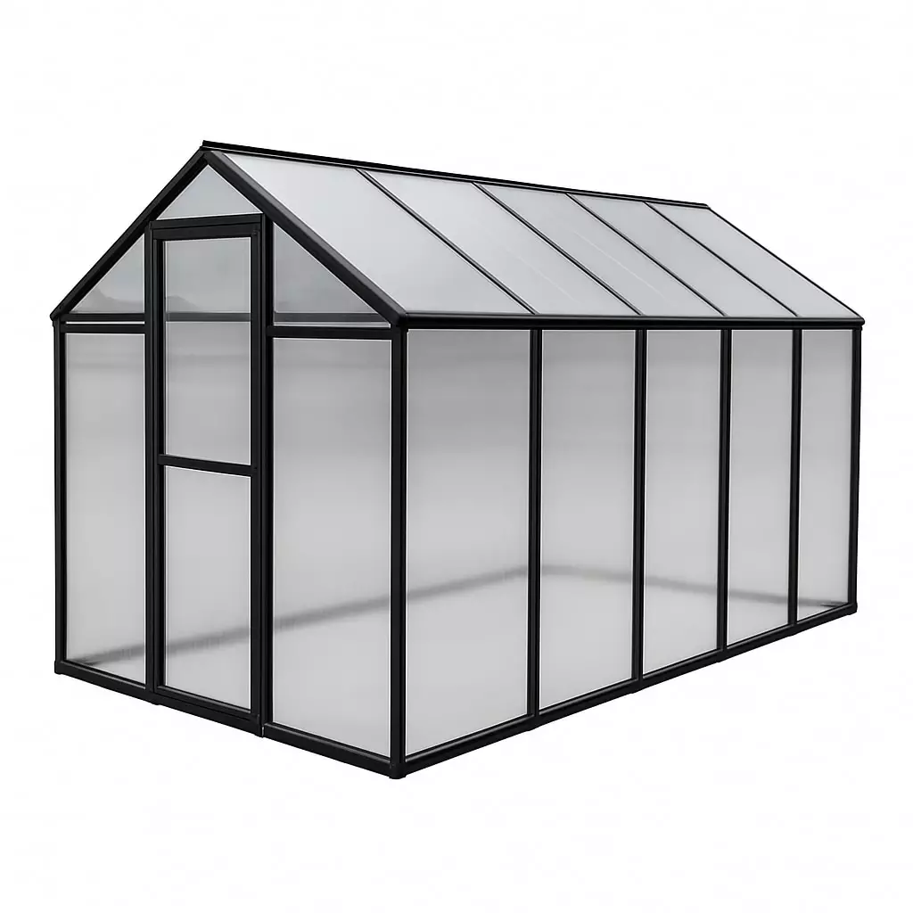 Ramen är tillverkad av slitstark aluminium och väggarna och taket är tillverkade av 4 mm polykarbonatplåt som släpper igenom mycket ljus. Hörnstycken i nylon minskar antalet skruvar som behövs för montering, vilket gör monteringen mycket enklare och snabbare. Ramens sidor har hängrännor för avledning och fördröjning av vatten. Taket har ett justerbart ventilationsfönster och växthusdörren öppnas utåt. Detaljerade steg-för-steg-monteringsanvisningar ingår.