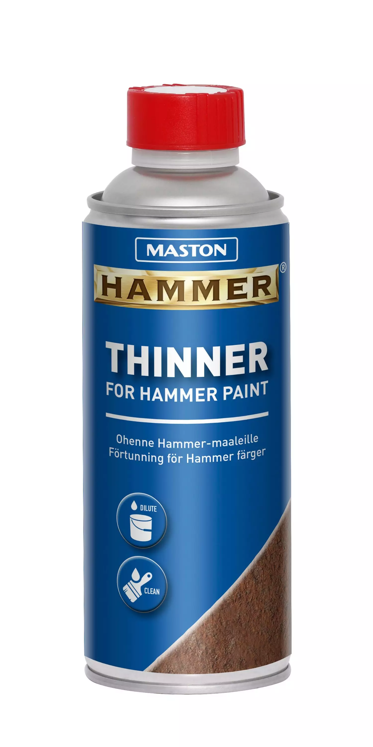 Maston Hammer Thinner Hammer för förtunning av metallfärger och tvätt för verktyg och penslar. Det är ett effektivt lösningsmedel för att ta bort torkade limfläckar och färger. Produkten är också ett mycket effektivt lösningsmedel för ytavfettning och annan rengöring.