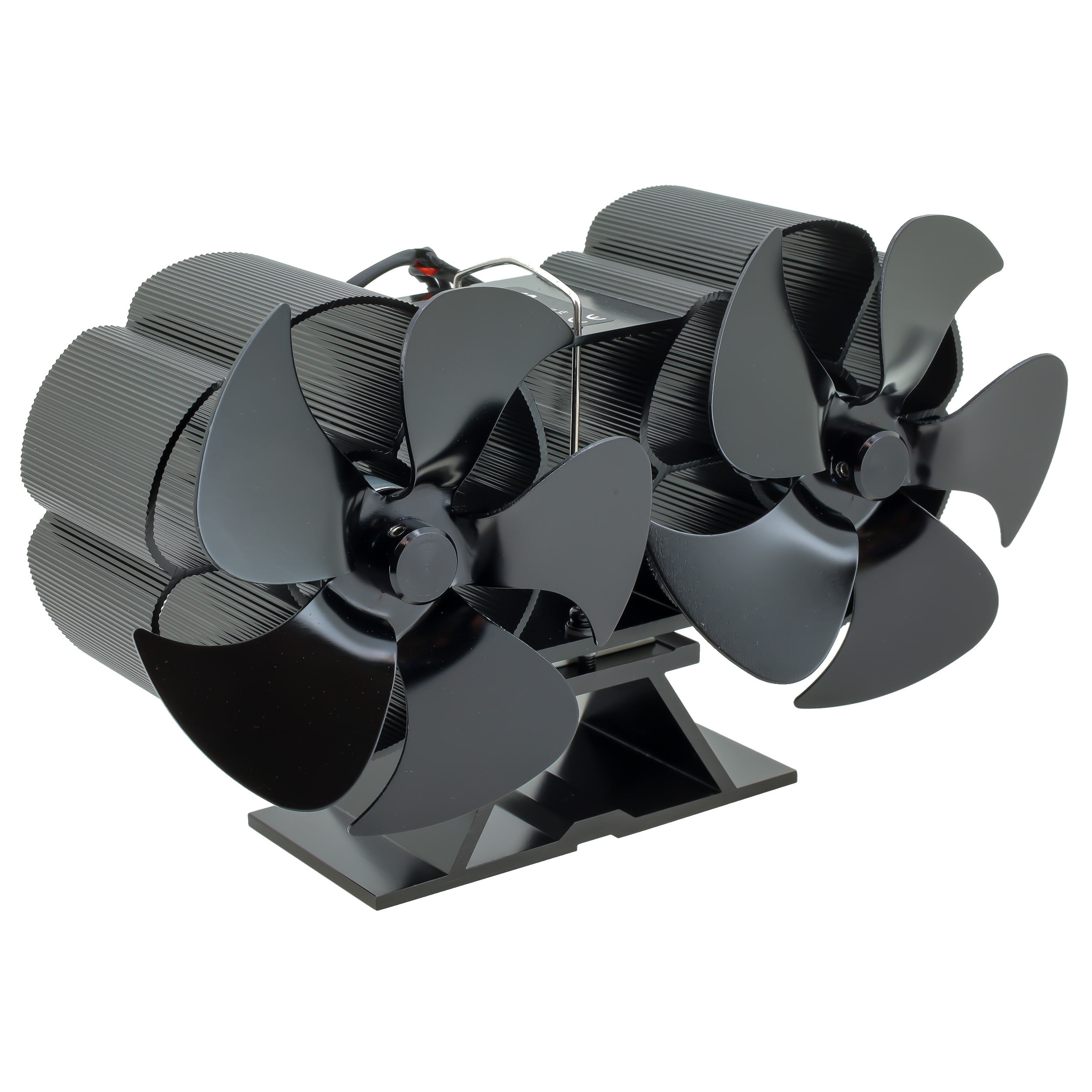Kaminfläkt dubbel. Återcirkulationskapacitet 220 CFM. Drifttemperatur 60 till 350 grader. Fungerar av värmen från kaminen eller eldstaden, inga sladdar eller batterier behövs.