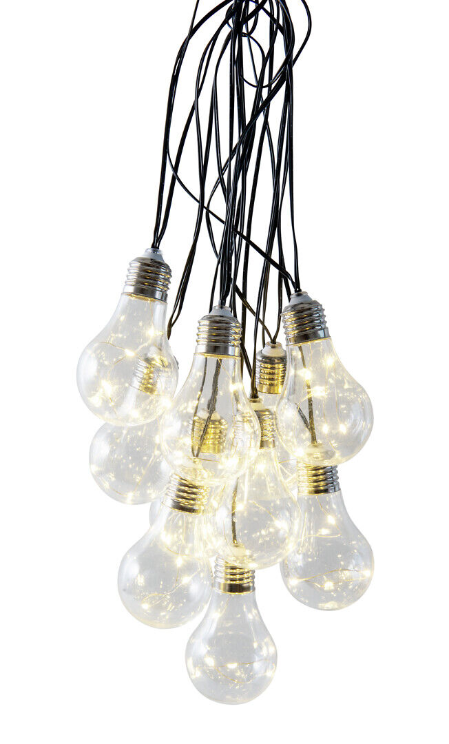 Soldriven lampsats med tio ljusa, glödlampsformade lampkupoler. Inuti varje lampa finns en ljustråd med fem lysdioder.