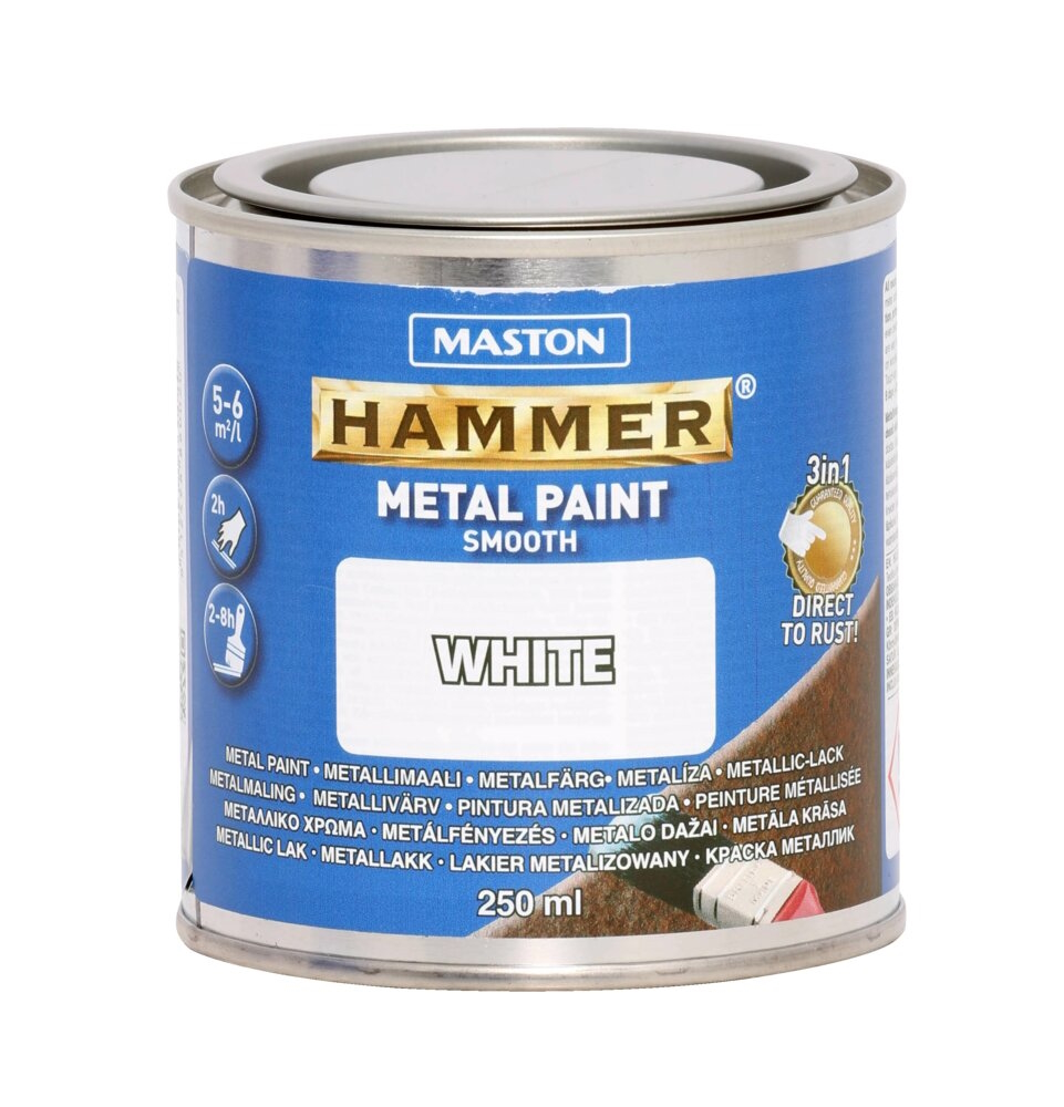 Mastons HAMMER SMOOTH (slät) METALLFÄRG, där rostskydd, primer och topplack tillsammans bildar en stark, blank yta för alla metallytor. Lämplig för inomhus- och utomhusbruk. Kan appliceras direkt på ytor som ska behandlas, inklusive rostiga ytor. Det luft- och fukttäta färgskiktet stoppar korrosion och skyddar metallytan effektivt. Även lämplig för bearbetning av träytor.
