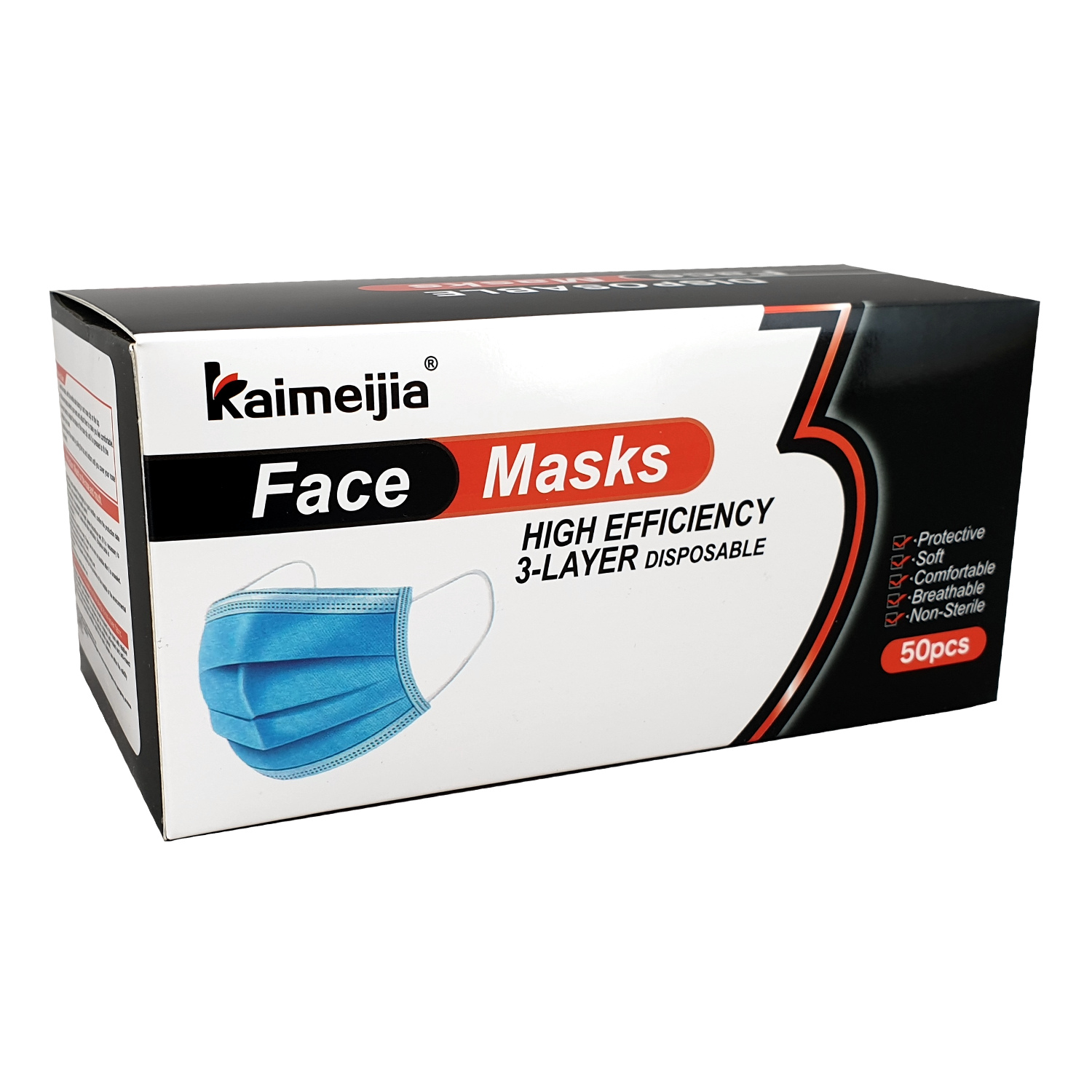 En förpackning med 50 st engångs munskydd som har 3-lager.
