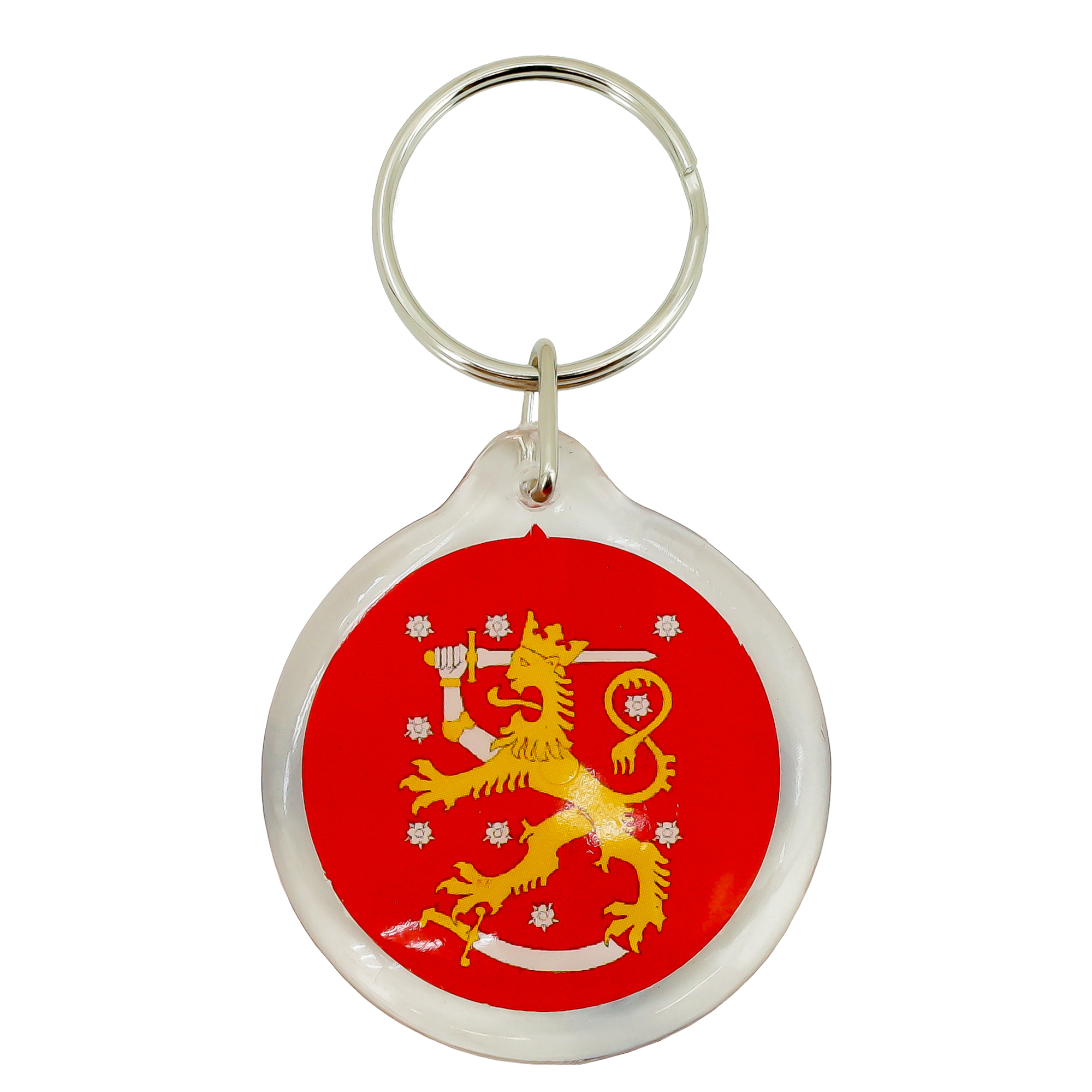 En snygg nyckelring med gult lejon på ena sidan och Finska flagga på andra sidan.