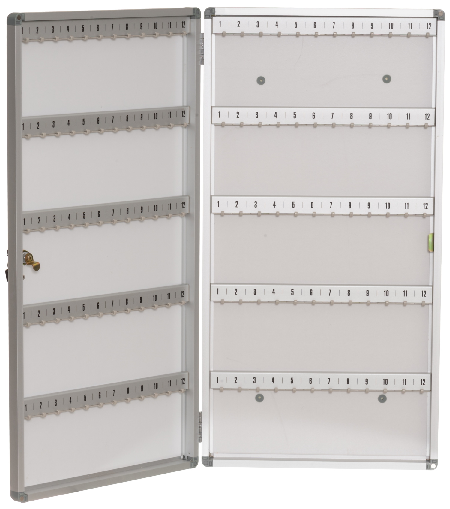 Låsbart nyckelskåp med aluminiumram för professionellt bruk. Förvara nycklarna säkert och i gott skick. Levereras med 2 nycklar för låsning av skåpet och 120 numrerade nyckelkrokar.