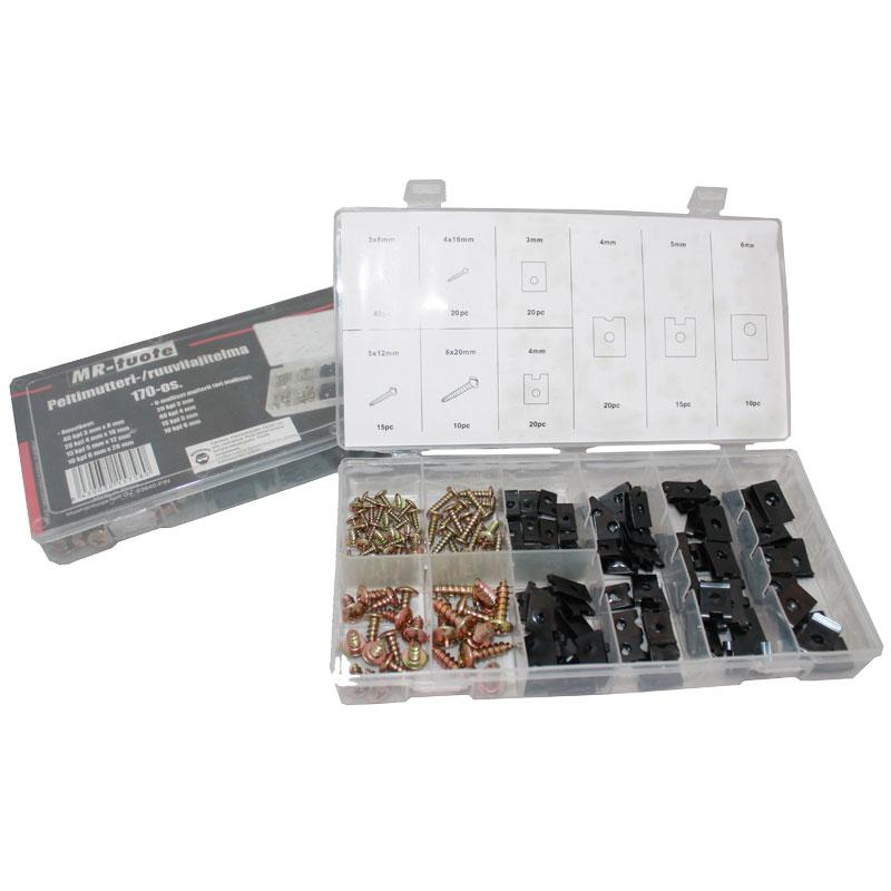 170-delars plåtskruv- och muttersats, innehållande olika storlekar av skruvar och U-formade muttrar.