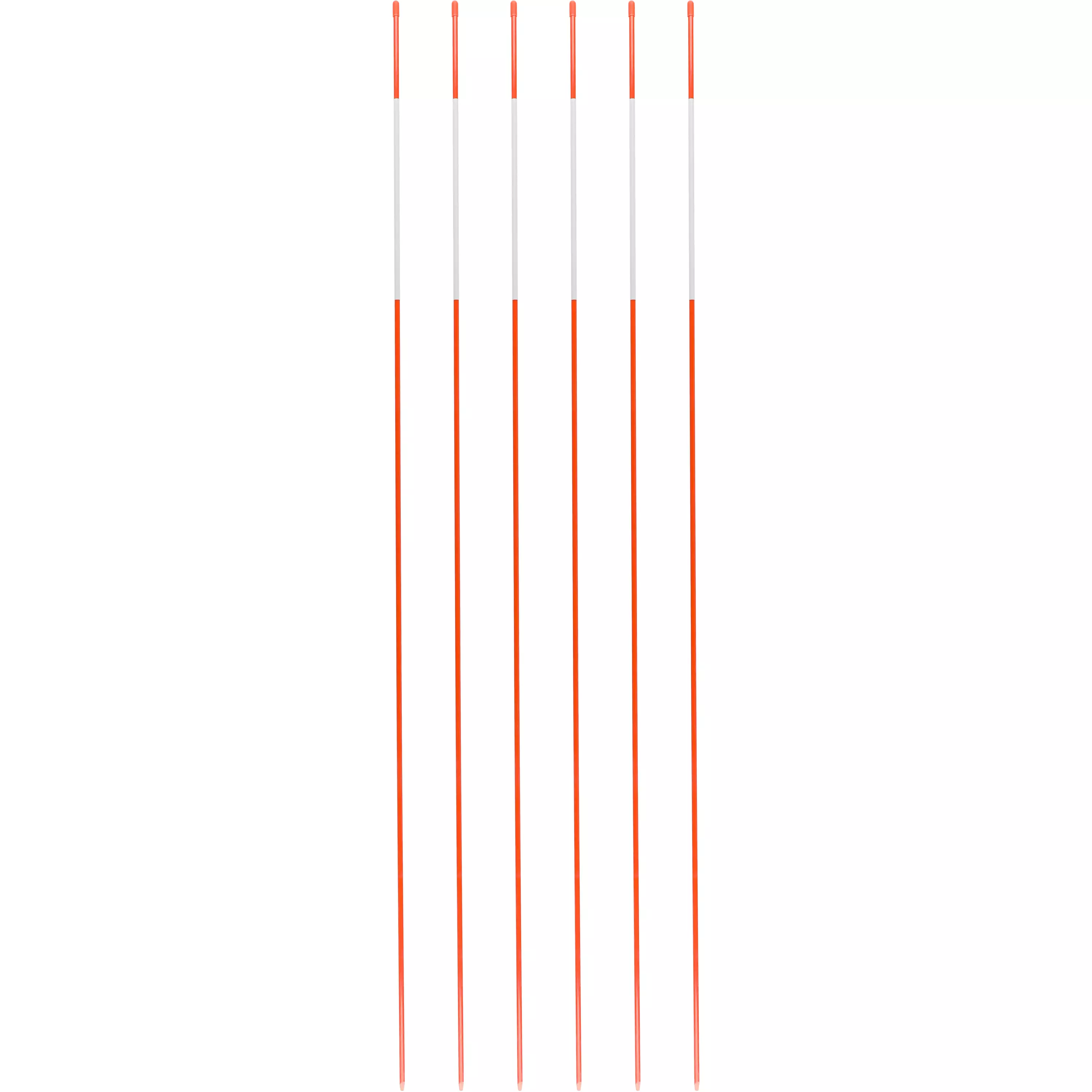 Slitstark snökäpp av glasfiber. Slipad nedre del, plugg upptill. 20 cm bred reflextejp på pinnen. 6 st i 1 pack.