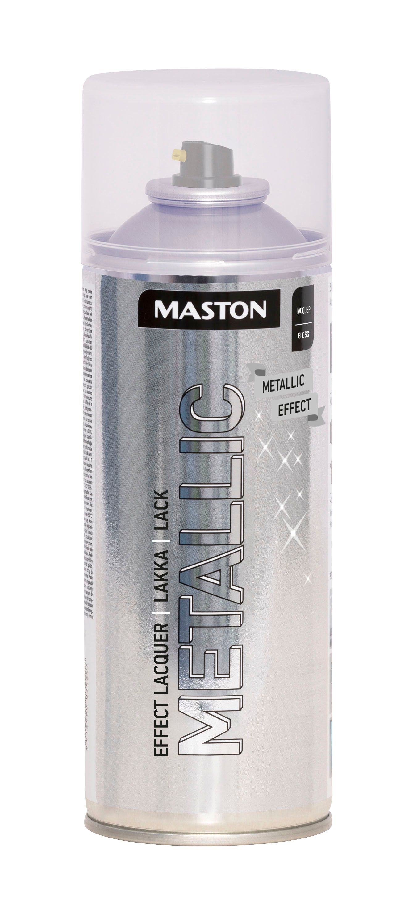 Maston Metallic är en högkvalitativ akrylsprayfärg med metalliska pigment. Färgen torkar snabbt och ytan blir slät och blank. Lämplig för många ytor som metall, trä, sten, glas och de flesta plastytor.