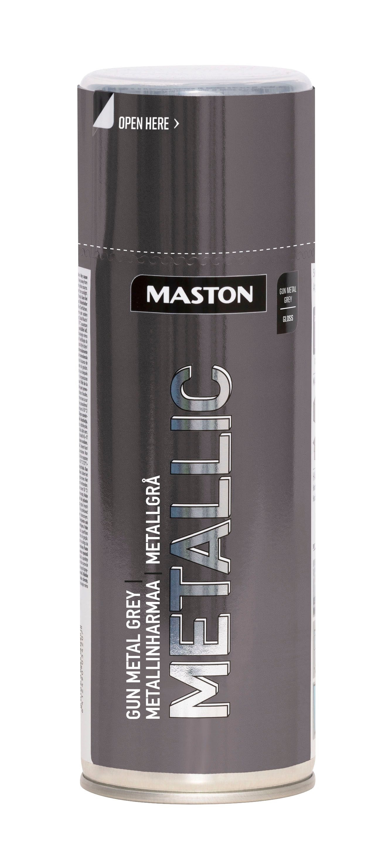 Maston Metallic är en högkvalitativ akrylsprayfärg med metalliska pigment. Färgen torkar snabbt och ytan blir slät och blank. Lämplig för många ytor som metall, trä, sten, glas och de flesta plastytor.