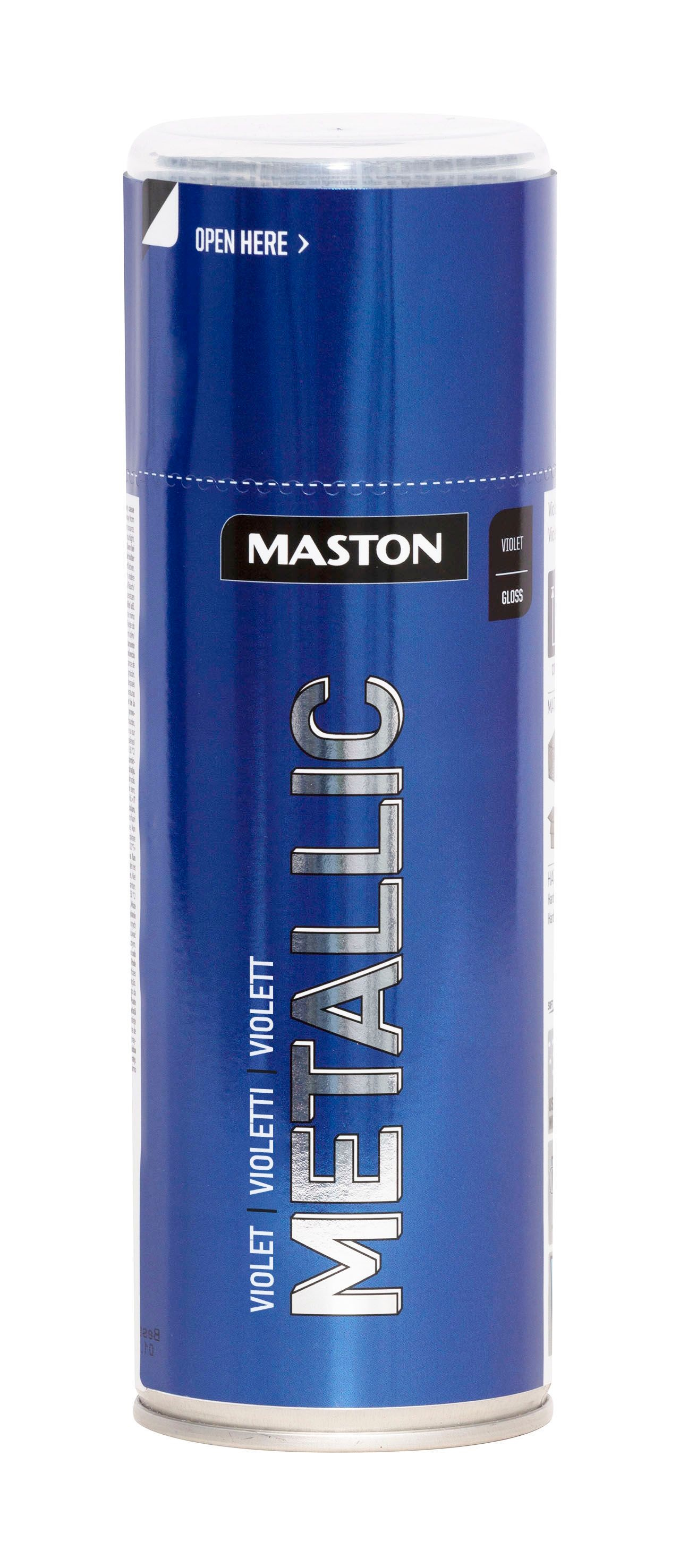 Maston Metallic är en högkvalitativ akrylsprayfärg med metalliska pigment. Färgen torkar snabbt och ytan blir slät och blank. Lämplig för många ytor som metall, trä, sten, glas och de flesta plastytor.
