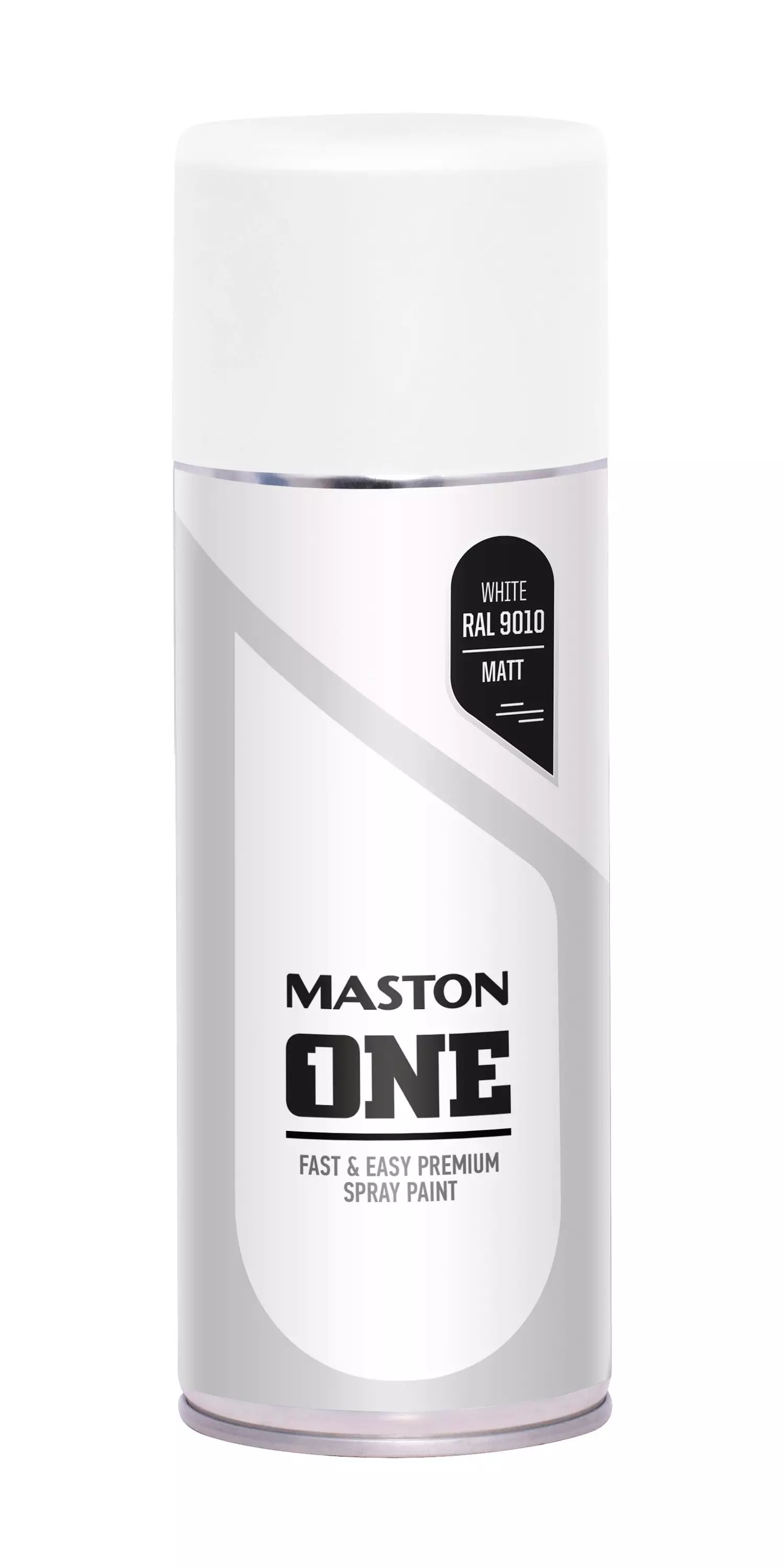 Maston One® sprayfärg - gör målningen enkel och snabb. Maston One® akrylfärg är lämplig för praktiskt taget alla ytor, inom- och utomhus. Maston One® färgserien har allt du behöver, primers, topplacker och lacker i alla glanser och i flera olika färgalternativ. Färgen har utmärkt vidhäftning.