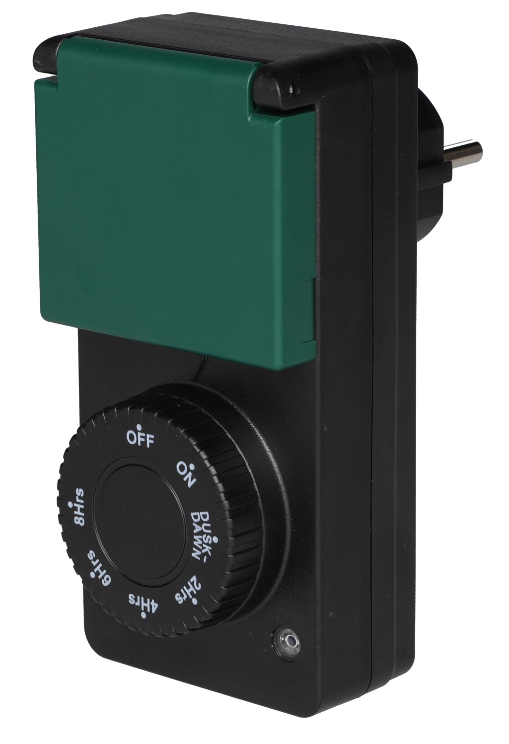 Elektronisk skymningstimer. Startar när det blir mörkt och stänger av det i starkt ljus. Kan också användas som skymningstimer: 2, 4, 6 och 8 timmars timerfunktioner som upprepas dagligen. Möjlighet att slå på eller stänga av strömbrytaren kontinuerligt. Utmärkt speciellt för att dekorera dekorativa och julbelysning för utomhusbruk.