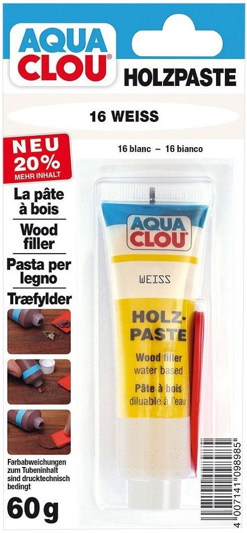 Vattenbaserat CLOU Träspackel är lätt att använda för att fylla hål och ojämnheter. Träspackel är avsedd för obehandlade träytor. Även lämplig för användning i våta utrymmen. Träspackel kan slipas, hyvlas, filas, sågas och svarvas, ytan kan behandlas som en träyta.