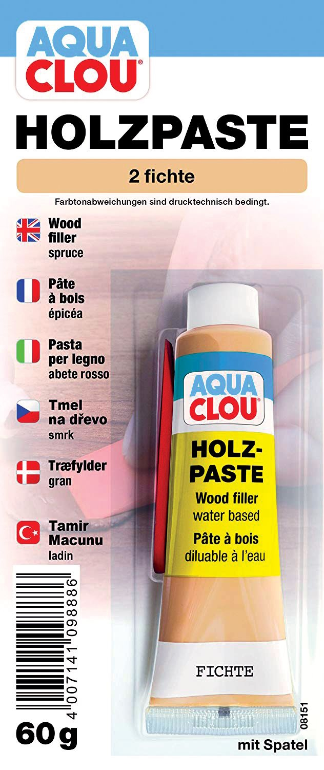 Vattenbaserat CLOU Träspackel är lätt att använda för att fylla hål och ojämnheter. Träspackel är avsedd för obehandlade träytor. Även lämplig för användning i våta utrymmen. Träspackel kan slipas, hyvlas, filas, sågas och svarvas, ytan kan behandlas som en träyta.