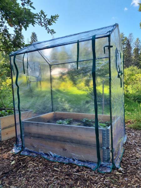 Lättmonterat växthus runt pallkragen.