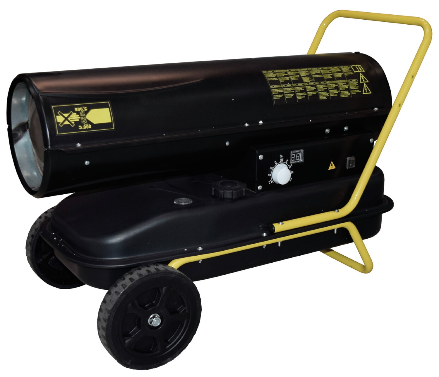Kraftfull 30 kW Harju hallvärmare / dieselvärmare för uppvärmning av stora välventilerade utrymmen såsom hallar. Pushmodell med hjul och handtag.