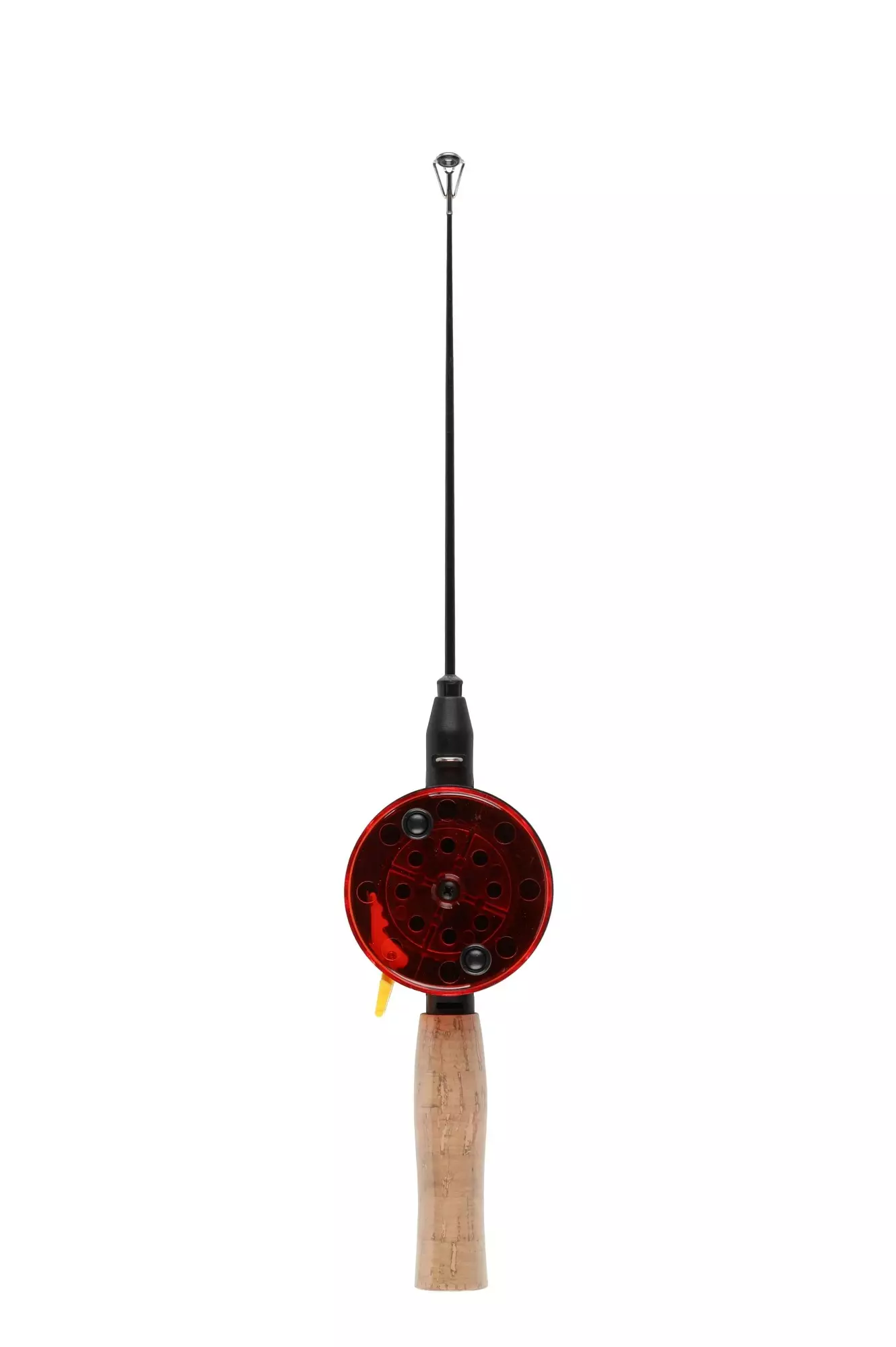 Robust Apaja-pimpelspö för fiske efter stor gädda och gös. Korkhandtag, hållbar röd rulle och gott om plats även för grövre lina. Linrekommendation 0,25–0,35 mm, betesrekommendation större balans- och vertikalpirkar.