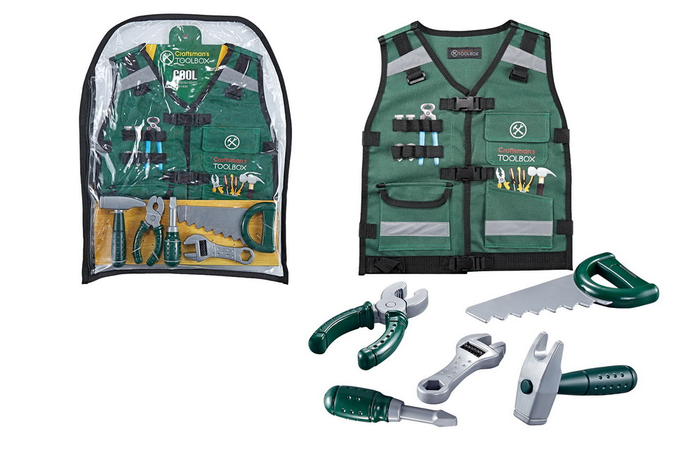 Verktygsväst för den lilla snickaren. Gott om fickor i västen och fem verktyg.