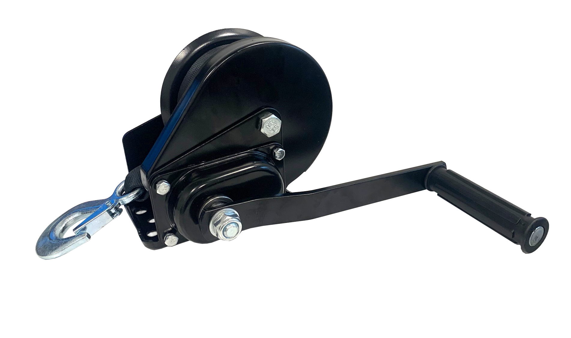 Enväxlad vinsch med broms med ca 544kg dragkraft. Med lina och krok 50mm x 8 meter.
