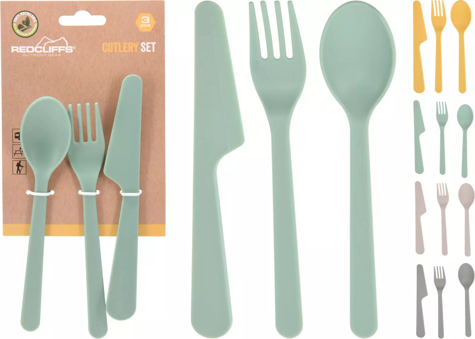 Lätt och hållbart bestickset från Redcliffs för camping. Innehåller gaffel, kniv och sked. Tillverkat av 51 % återvunnet material.