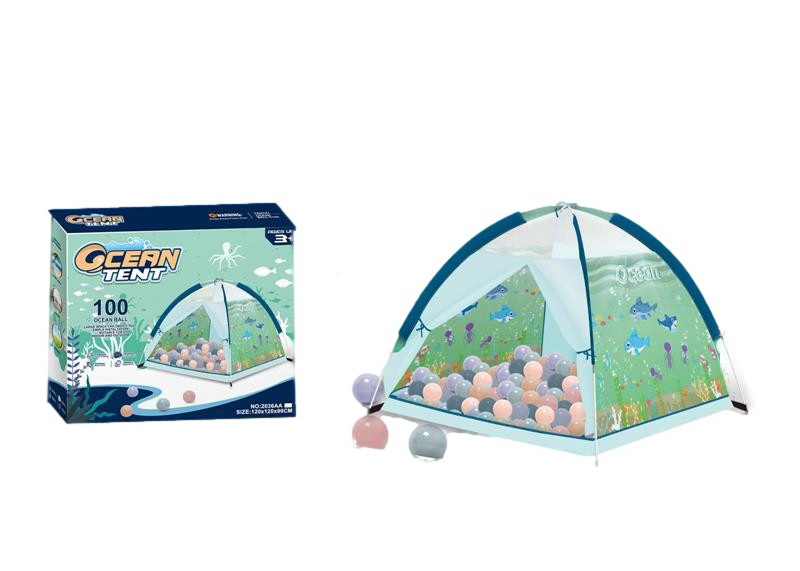 Fiskmönstrat kupoltält för lek inomhus eller utomhus! Paketet innehåller 100 små bollar, som du kan lägga i tältet för att skapa ett hav av bollar!