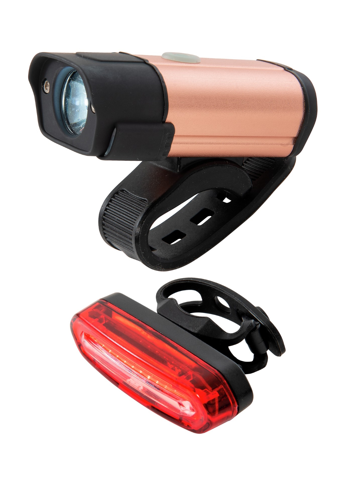UBS uppladdningsbara cykellampor. Ljuseffekten för både fram- och bakljus kan justeras. 100 % - 50 % - 30 %, blinkar vid 50 % effekt. Framljus 3,7 V 1200 mAh, bakljus 400 mAh. Led fast 5 W 300 lm. Drifttid framljus ca 3,5 h, Drifttid bakljus ca 4 h med full laddning.