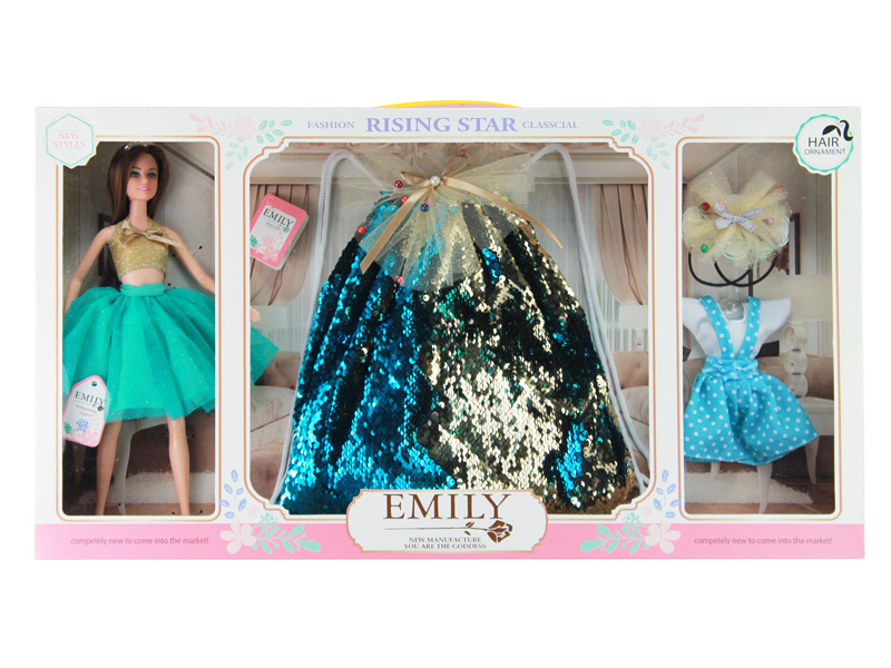 Modedocka och en fin paljettryggsäck. Setet innehåller 2 uppsättningar kläder till dockan och smycke för håret. Dockans storlek är 29 cm.