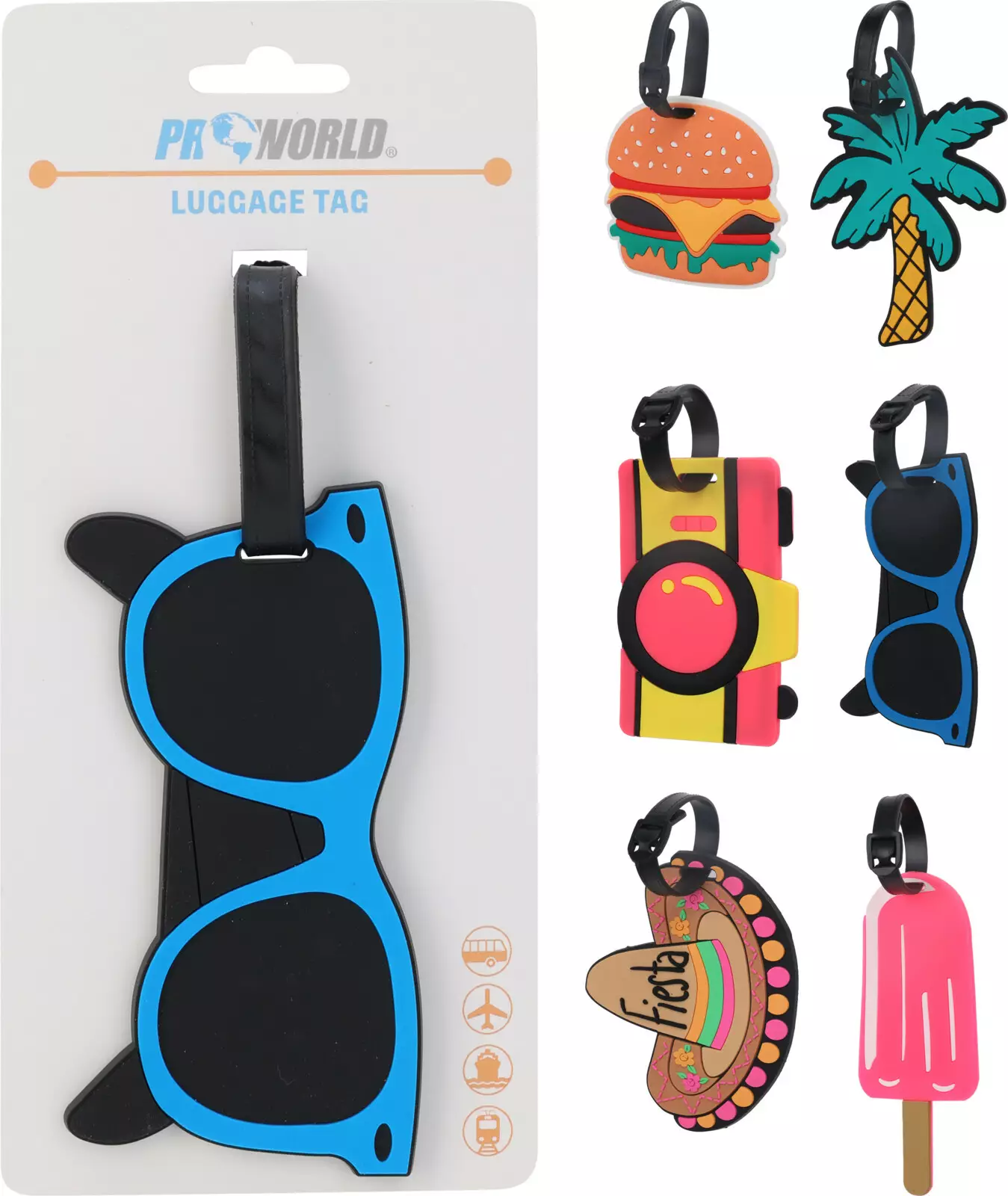 Sortimentet innehåller sex glada och färgglada mönster: solglasögon, glass, palmträd, sombrero, kamera och hamburgare. Varje design ger ditt bagage en personlig touch och gör det lätt att känna igen på flygplatser, kryssningar eller bussresor. Leveransen innehåller en slumpmässigt vald modell, om inte kunden önskar en specifik design.
