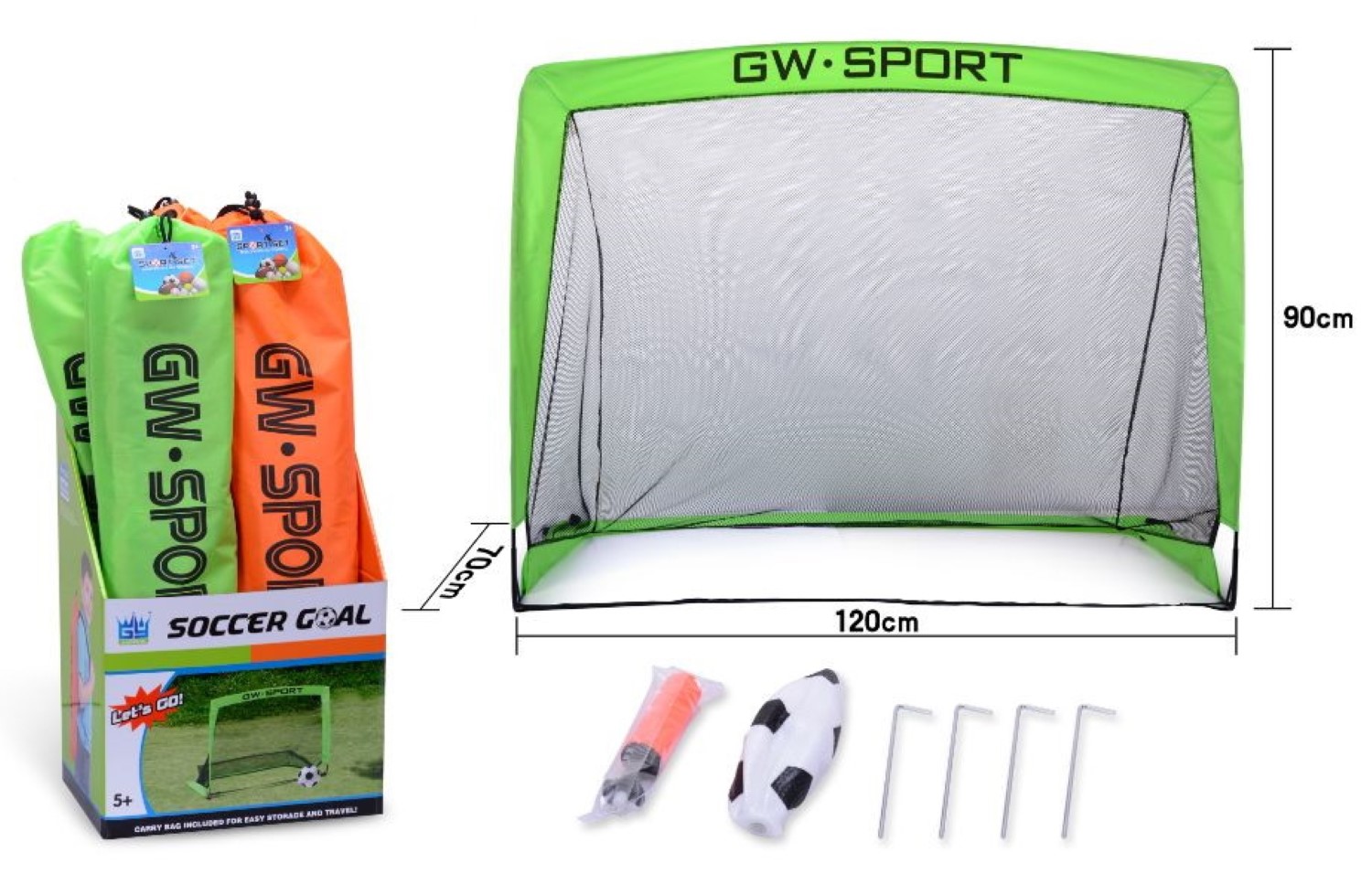 Färgglatt fotbollsmål för trädgårdsspel. Målet kan fällas upp och tas ned ungefär som ett tält, vilket gör den enkel att ta med på resa eller för att packa in för vinterförvaring. En väska medföljer också. Bredd 120 cm, höjd 90 cm, djup 70 cm. Sortiment av 2 färgalternativ, grönt och orange.